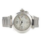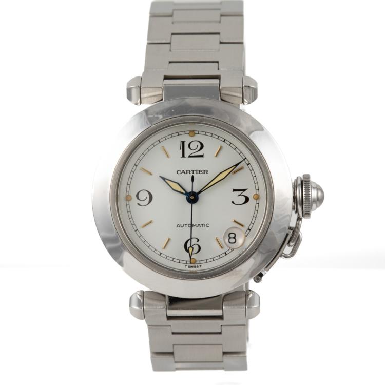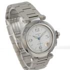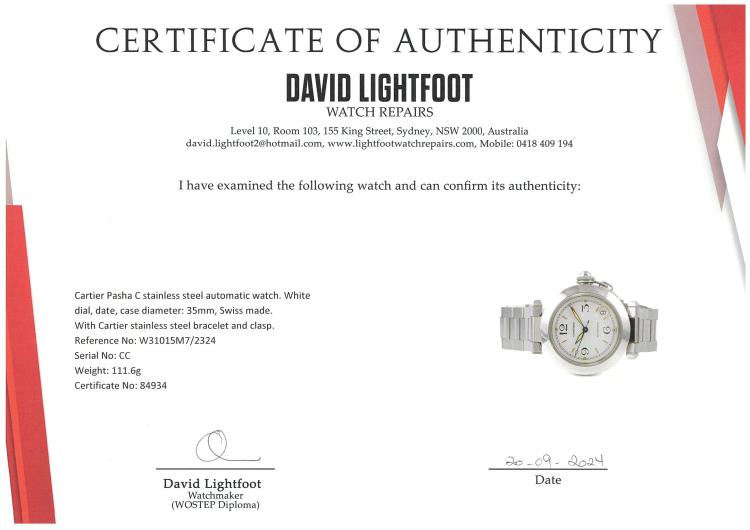 Cartier Pasha C stainless steel automatic watch. White dial, date, case diameter: 35mm, wrist size: 19cm, Swiss made. Ref #W31015M7/2324. With Cartier stainless steel bracelet and clasp. With Certificate of Authenticity, Service invoice dated 3/10/24 and Cartier box. 12 month David Lightfoot Watch Repair warranty from the date of full service. (Pre-owned)