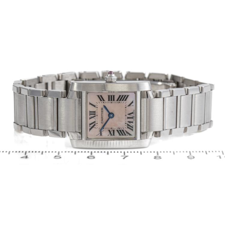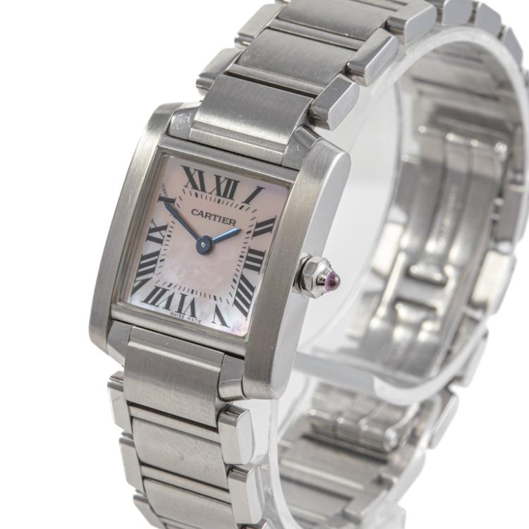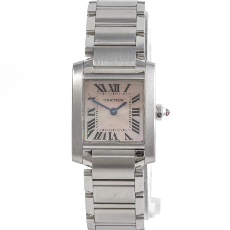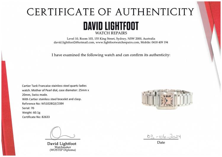 Cartier Tank Francaise stainless steel quartz ladies watch. Mother of Pearl dial, case diameter: 25mm x 20mm, wrist size: 15.5cm. Swiss made. Ref# W51028Q3/2384. With Cartier stainless steel bracelet and clasp. With Certificate of Authenticity. 3 month FSA warranty.(Pre-owned)