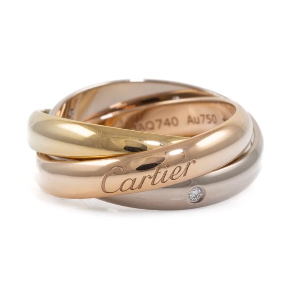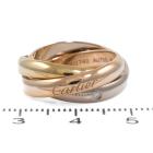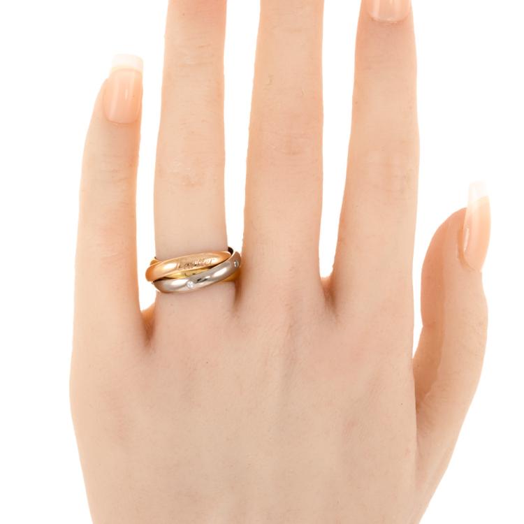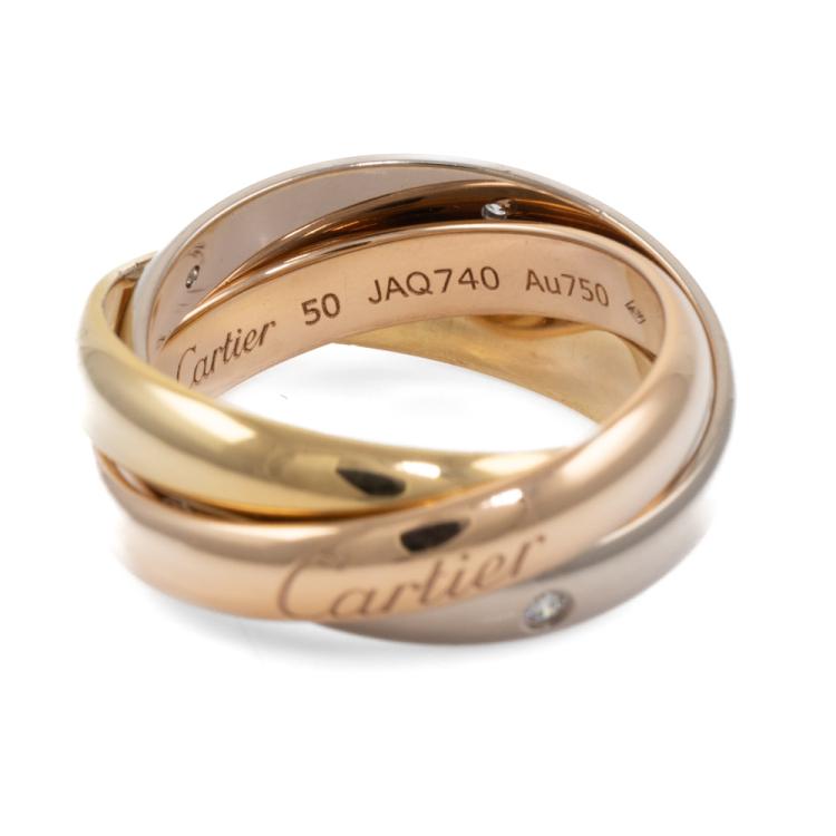 Cartier Trinity ring with 5 round Natural Diamonds totalling 0.06ct. 18ct yellow, rose and white fold. Cartier stamped size 50, actual ring size K - ring resizing is not recommended. Individual band width: 3.5mm. Weight: 9.6g. With Cartier Certificate dated 25/02/20 and Cartier Box (Pre-owned)