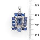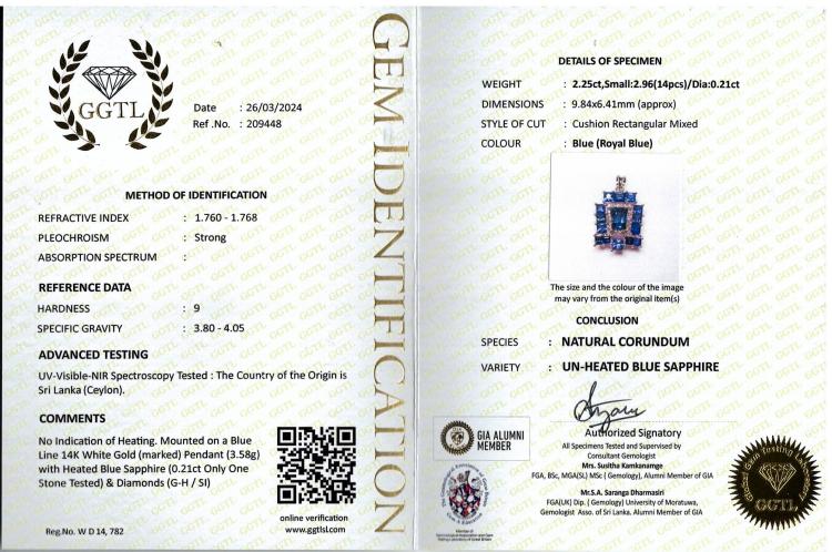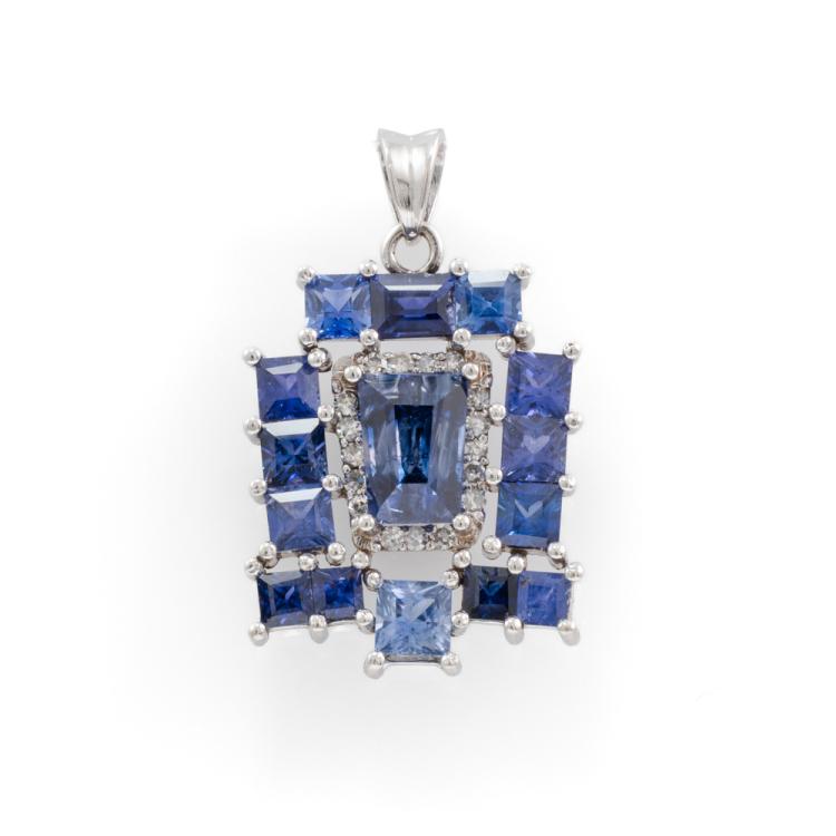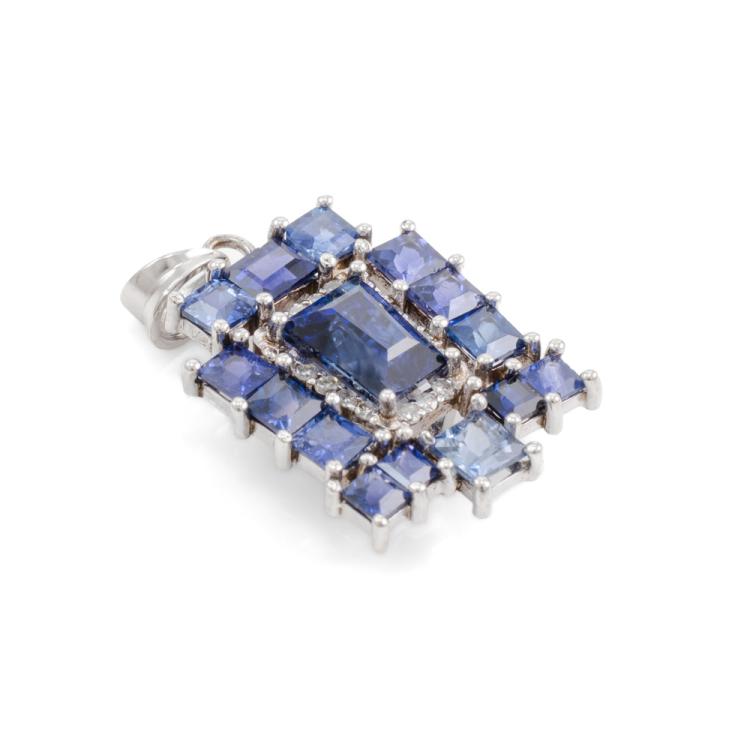 Sapphire and Diamond pendant with carre, tapper baguette & baguette cut Ceylon natural blue Sapphires totalling 5.21ct (note central Sapphire is unheated) and round natural Diamonds totalling 0.21ct. 14ct white gold. No chain provided. Weight: 3.5g. With GGTL Report #209448. (As new)