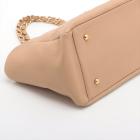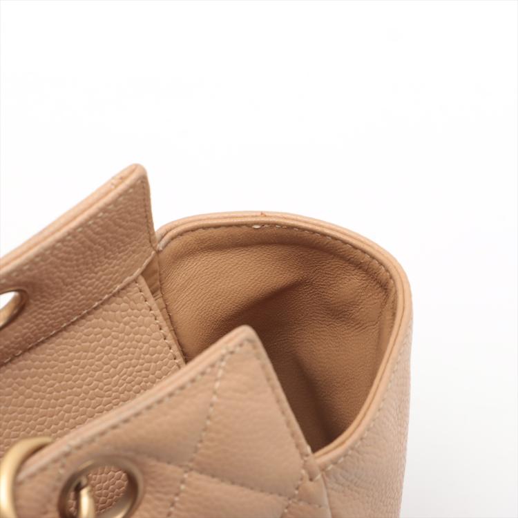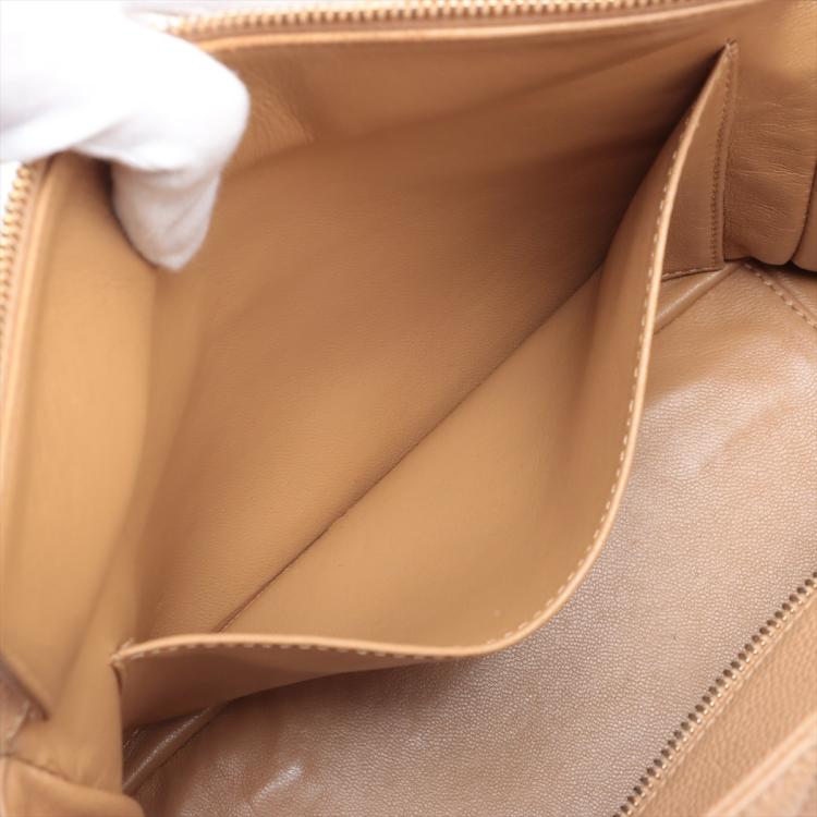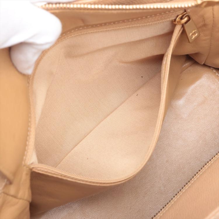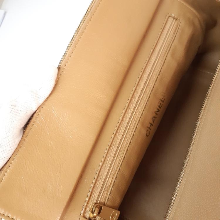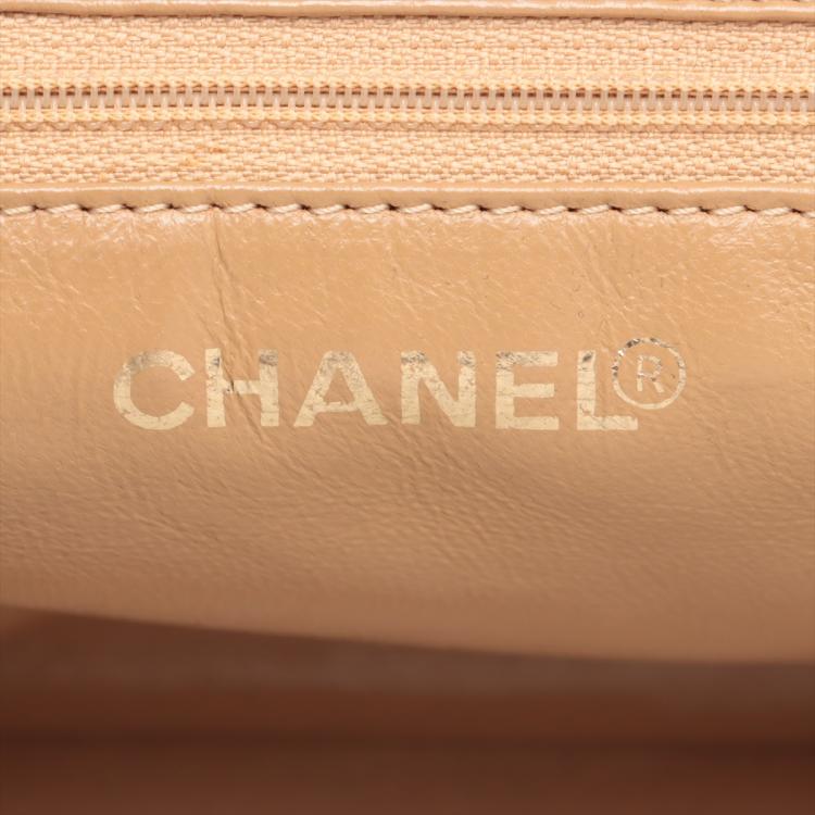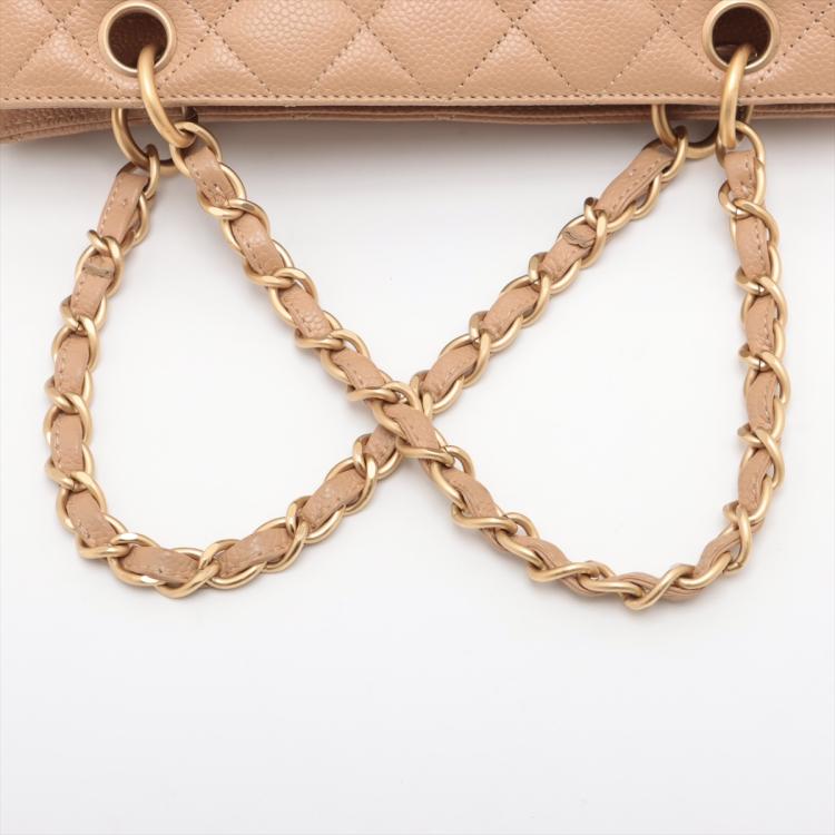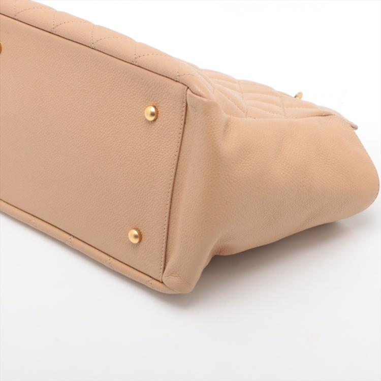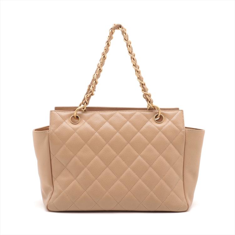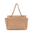Chanel Petite Timeless tote chain bag in beige Caviar diamond-quilted leather (serial#6xxxx83). Featuring matte gold-hardware, stitched "CC" logo at front, and dual leather and chain intertwined handles. The zipper top opens to a beige fine grain leather interior with a patch and zipper pockets. Approximate dimensions: 25.5cm(L) x 19cm(H) x 14cm(D), handle drop 15cm. Accompanied by a Chanel dustbag. With Entrupy Certificate of Authenticity. (Pre-owned)