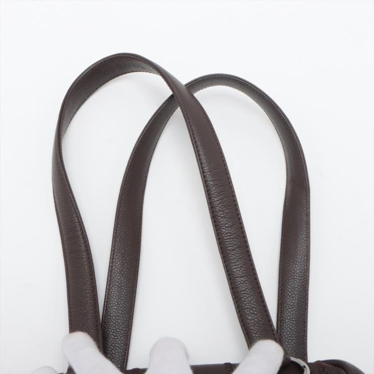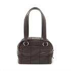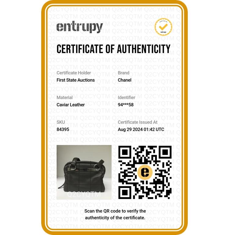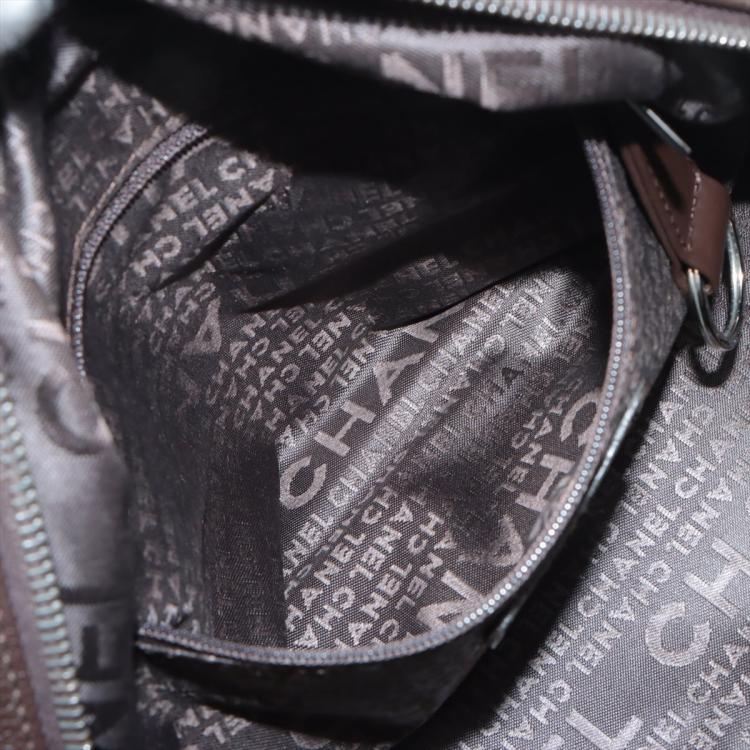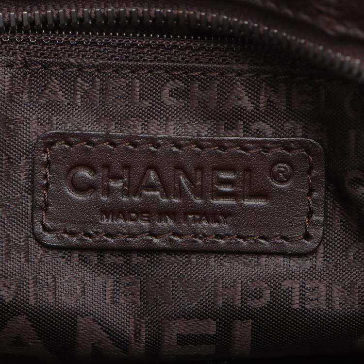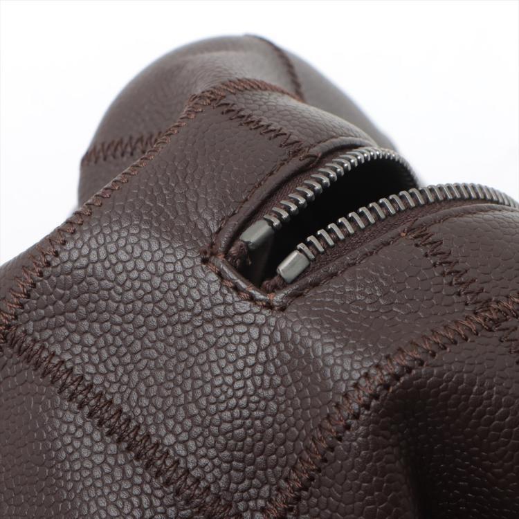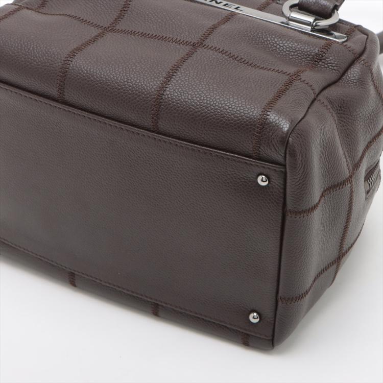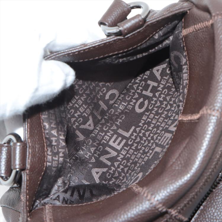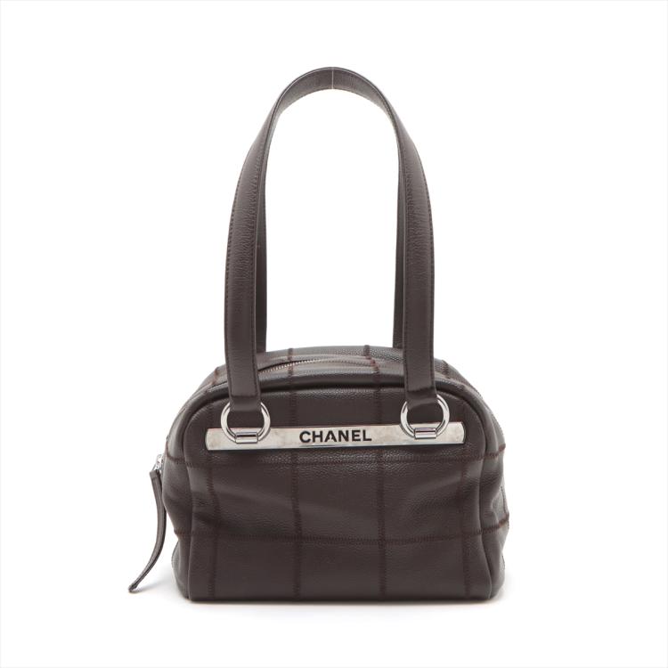 Chanel ChocoBar shoulder bag in dark brown caviar leather with ChocoBar quilting (#9xxxx58). Featuring dark silver-toned hardware, Chanel logo plaque, and exterior back patch pocket. The zipper top opens to brown logo printed textile interior with detachable keyring, and zipper and patch pockets. Approximate dimensions: 21cm(L) x 17cm(H) x 15.5cm(D), handle drop 23.5cm. Accompanied by Chanel Authentication card. With Entrupy Certificate of Authenticity. (Pre-owned)