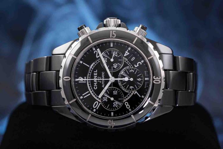 Chanel J12 ceramic and stainless steel automatic mens watch. Black chronograph dial, date, case diameter: 41mm, wrist size: 19.5cm, Swiss made. Ref# H0940. With Chanel black ceramic bracelet and clasp. With Certificate of Authenticity, Chanel International Guarantee card dated 15/08/2007 and Chanel box. 3 month FSA warranty (Pre-owned)