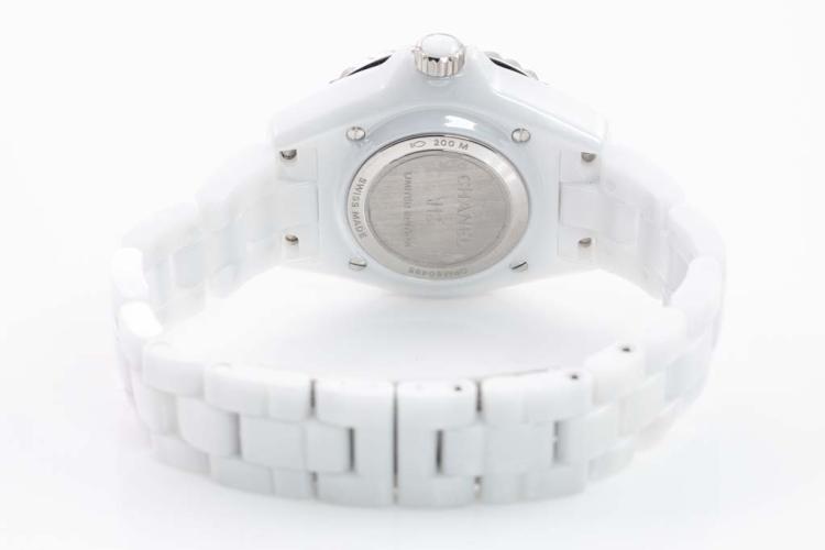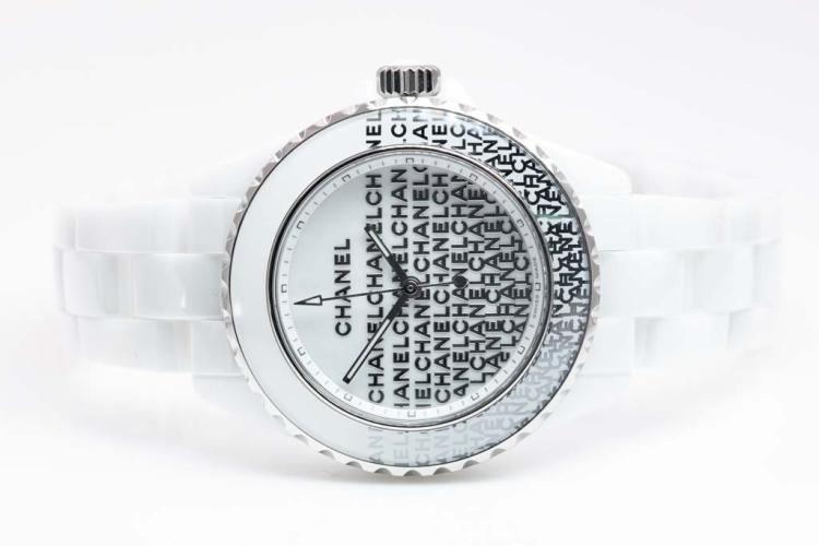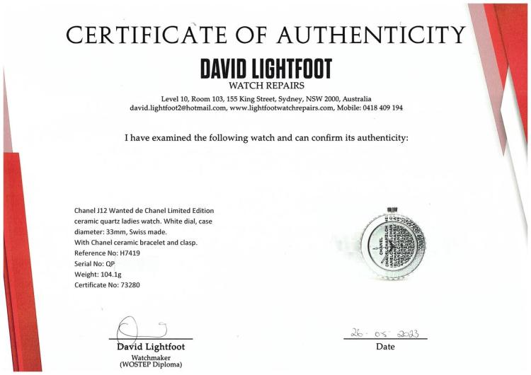 Chanel J12 Wanted de Chanel Limited Edition ceramic quartz ladies watch. White dial, case diameter: 33mm, wrist size: 16.5cm, Swiss made. Ref# H7419. With Chanel ceramic bracelet and clasp. With Certificate of Authenticity, Chanel International Warranty Card dated 25/2/2023 and Chanel box. Balance of 5 year Chanel manufacturer warranty applies. (Pre-owned)