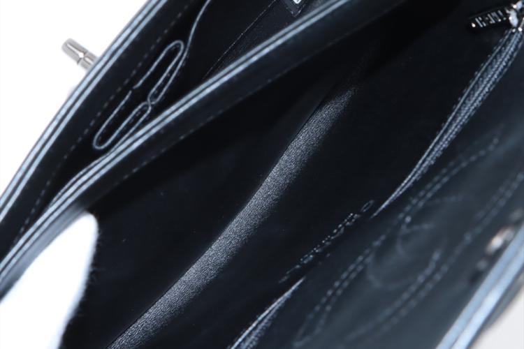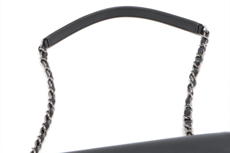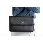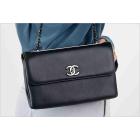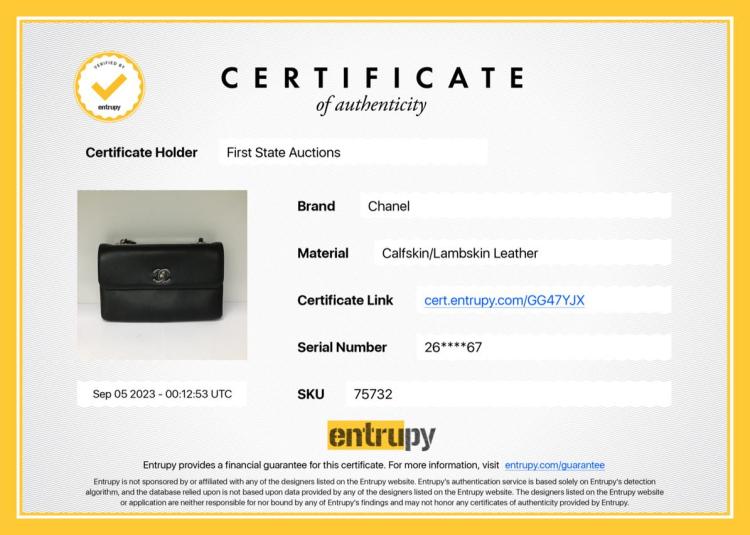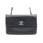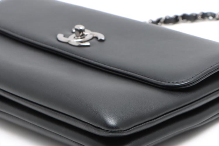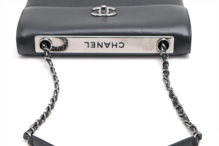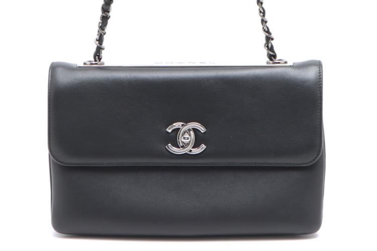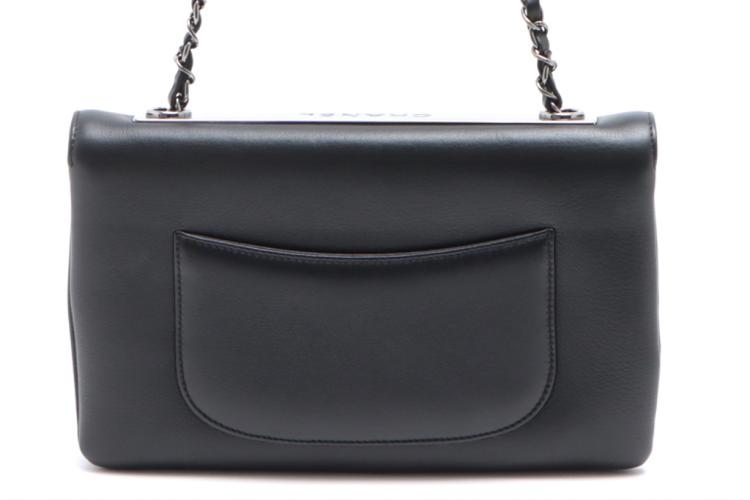 Chanel Trendy CC flap bag in black smooth calfskin leather (serial #26xxxxxx). Featuring black/silver-toned hardwear, an exterior pocket at back, single flap with CC logo turn-lock closure. The flap opens to a black leather lining interior with 2 of organisational compartments. Approximate dimensions: 26.5cm(L) x 16.5cm(H) x 4.5cm(D), 32cm leather-chain shoulder strap drop. With Entrupy Certificate of Authenticity. (Pre-owned)