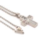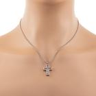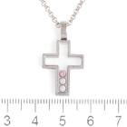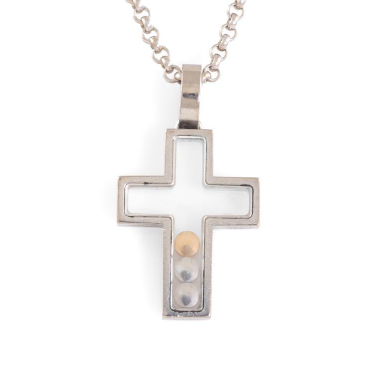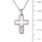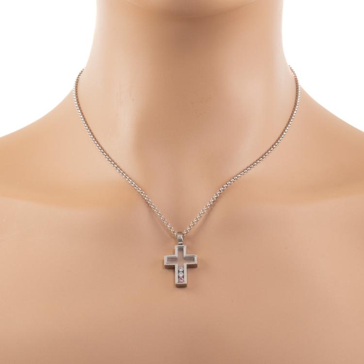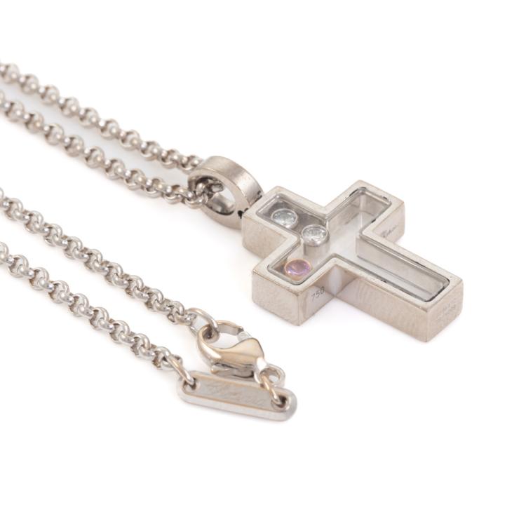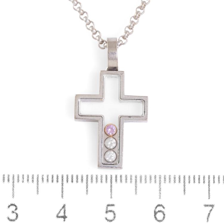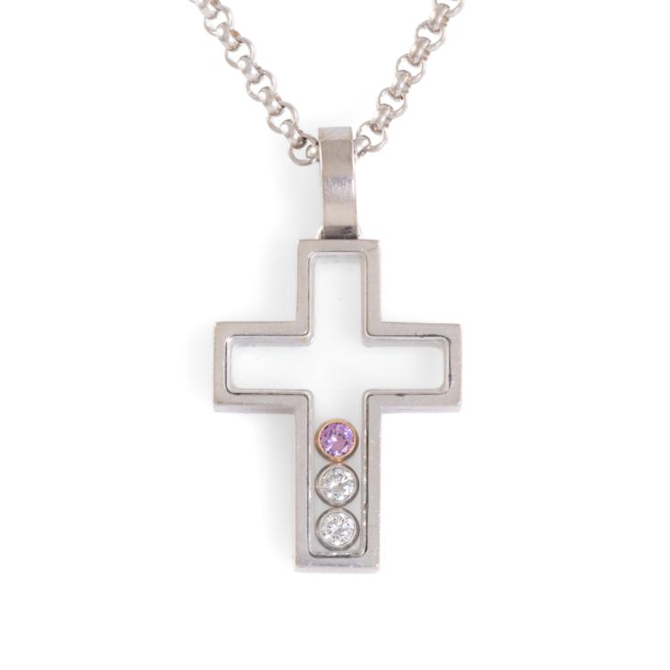 Chopard Happy Diamond Cross pendant with 2 floating round Natural Diamonds totalling 0.10ct and a floating round pink Natural Sapphire of 0.05ct. Pendant size: 26mm x 15mm. 18ct white gold with Chopard 18ct white gold 42.5cm chain. Weight: 12.3g. (Pre-owned)