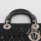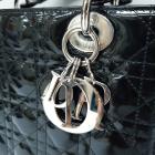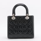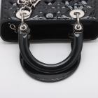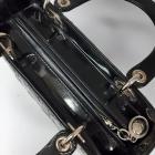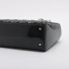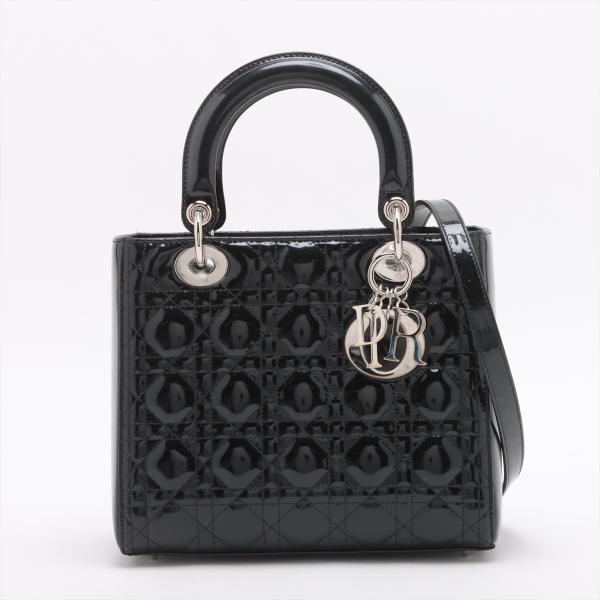 Christian Dior medium Lady Dior handbag in black patent leather with Cannage quilting. Featuring silver-toned hardware, leather top handles, 'DIOR' charms at front, a removable shoulder strap. The zipper closure opens to a black logo printed textile interior with a zipper pocket. Approximate dimensions: 23.5cm(L) x 20cm(H) x 11cm(D), handle drop 10cm, strap drop 44cm. Accompanied by Dior dustbag and authentication card. With Entrupy Certificate of Authenticity. (Pre-owned)