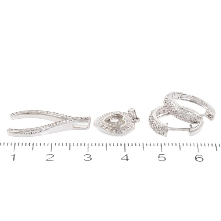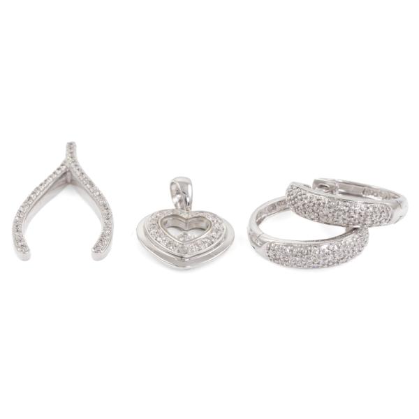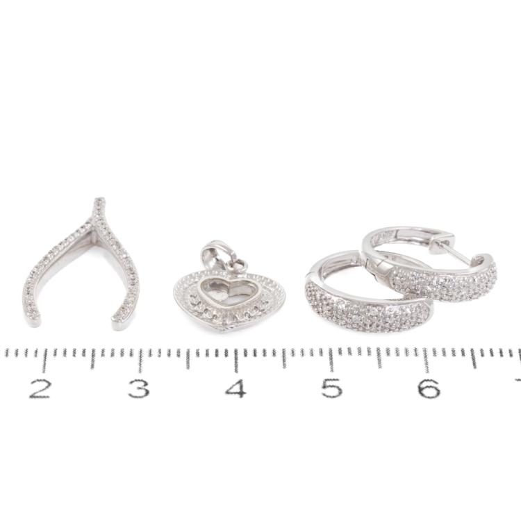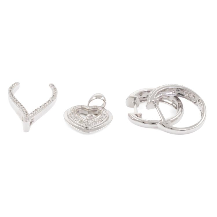 Set of 2 Diamond Pendants and 1 pair of Diamond earrings set in 9ct white gold. 1) Diamond pendant with Natural Diamonds totalling 0.10ct and 2) Diamond heart pendant with round & floating Natural Diamonds totalling 0.10ct. Total weight of 2 pendants: 2.8g. Diamond huggie earrings with Natural round Diamonds of 0.10ct. Weight of 2.0g. (As new)