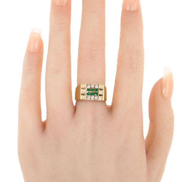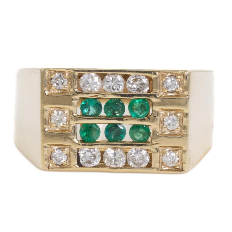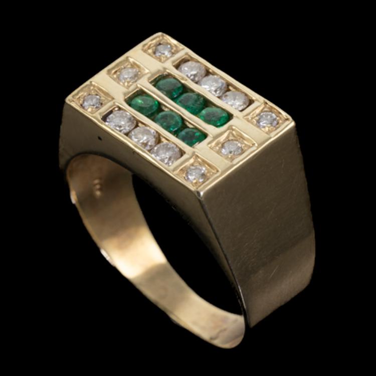 Mens ring with 6 round natural Emeralds totalling 0.22ct and round natural Diamonds totalling 0.33ct (Estimated grading: H SI-P1). 14ct yellow gold. Ring size N1/4. Band width: 3.0mm - 7.5mm. Weight: 5.2g (As New)