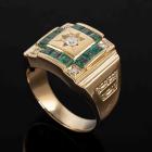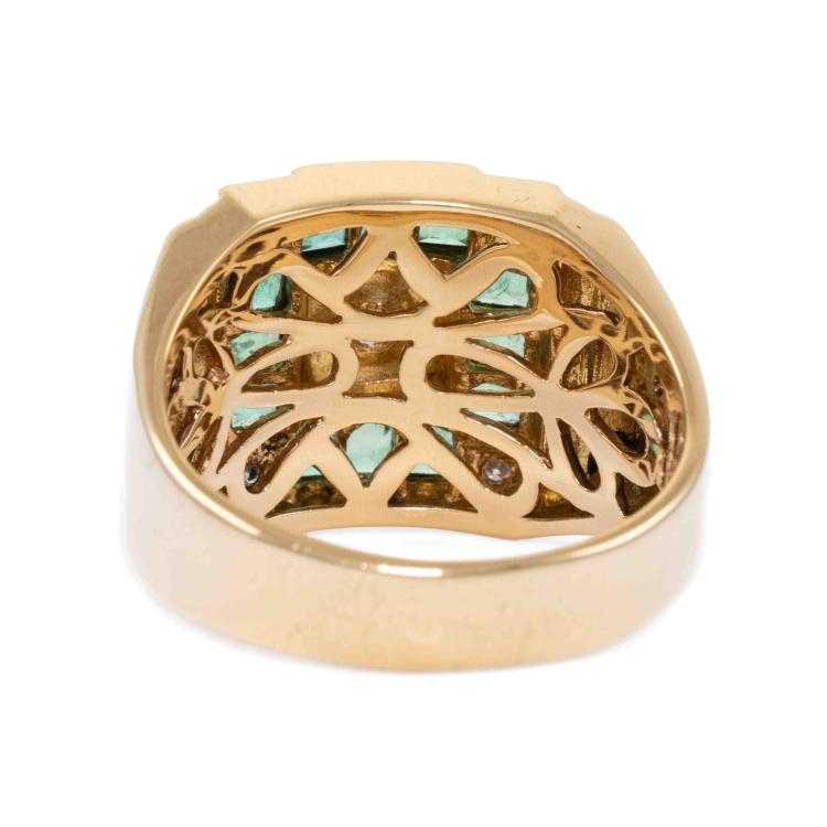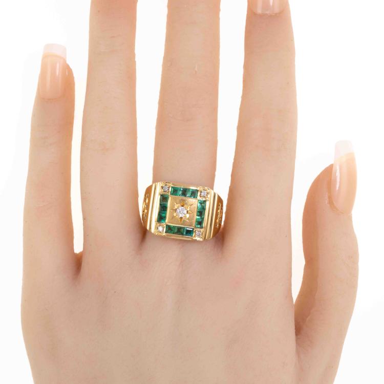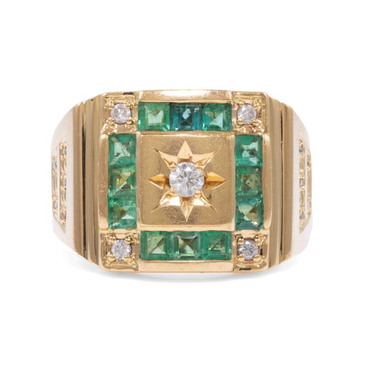 Emerald and Diamond mens ring with carre cut Natural Emeralds totalling approximated 0.54ct and round Natural Diamonds totalling 0.20ct. (estimated grading: I-J P1.) 18ct yellow gold. Ring size R. Band Width: 4.50 -5.75mm. Weight: 11.5g (pre-owned)