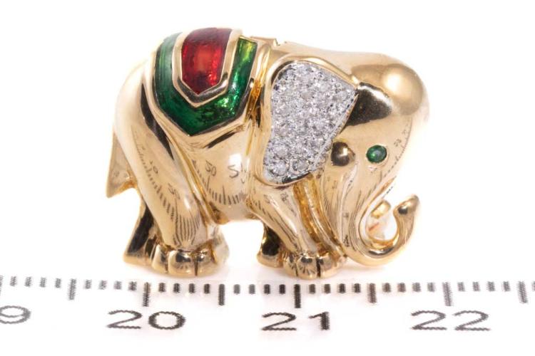 Emerald and Diamond elephant design brooch/pendant with red & green enamel, a round Natural Emerald of approximately 0.01ct and round Natural Diamonds totalling approximately 0.08ct. 18ct yellow gold. Weight: 9.5g. (Pre-owned)