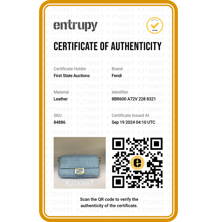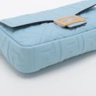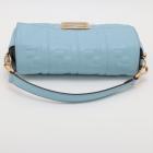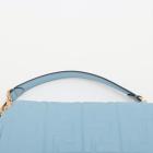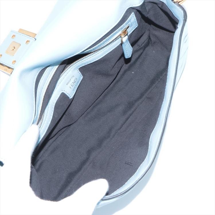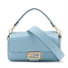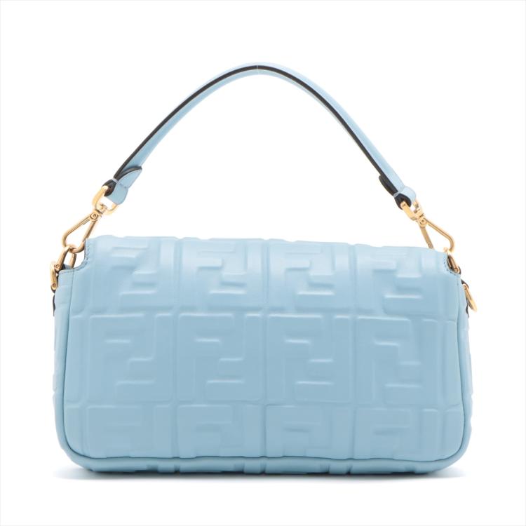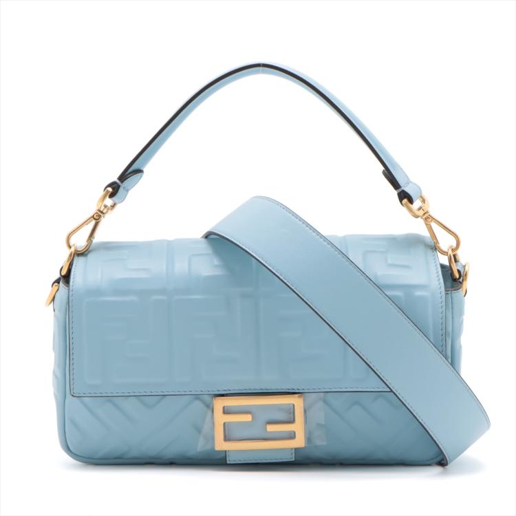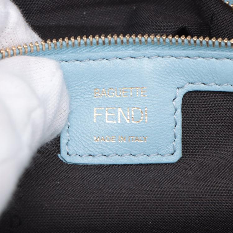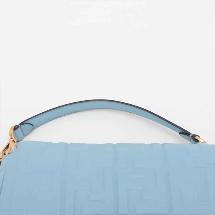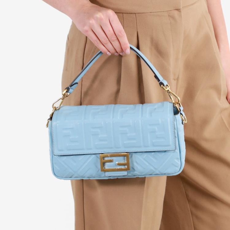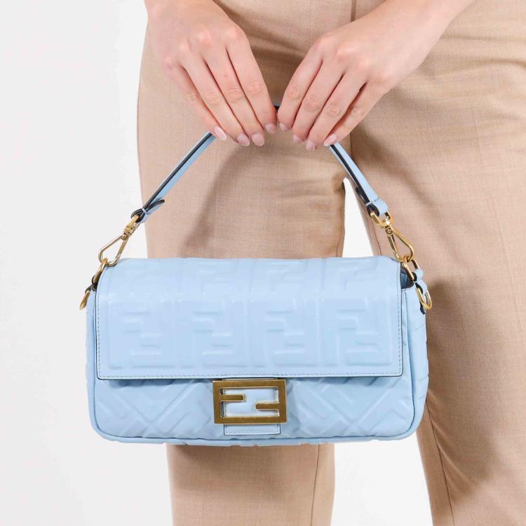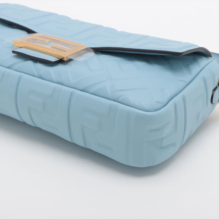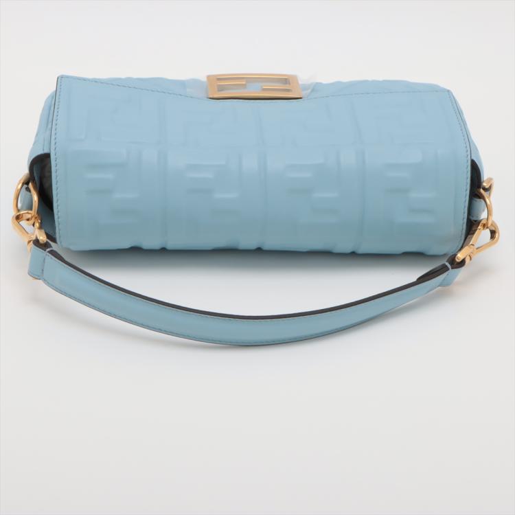 Fendi Baguette bag in light blue lambskin leather with a 3D-effect embossed iconic FF motif. Featuring iconic underarm design with single handle, gold tone hardware, front flap with an FF logo detailed magnetic button closure. This opens to a brown fabric lining interior with a zip pocket. Approximate dimensions: 26cm(L) x 15cm(H) x 6cm(D), 16cm handle drop and 40cm strap drop, removable. With Entrupy Certificate of Authenticity. (Pre-owned)