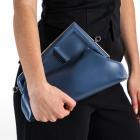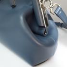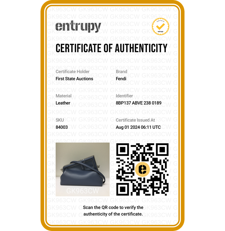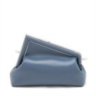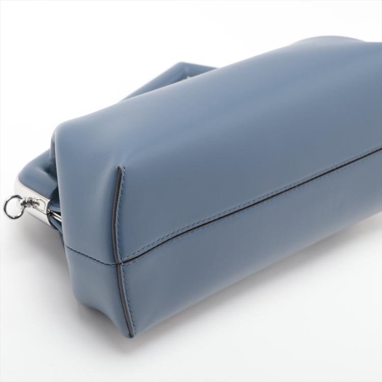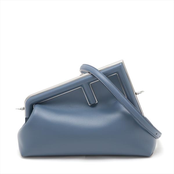 Fendi First small shoulder bag in blue Nappa leather. Featuring silver-toned hardware, an oversized metal F-shaped clasp with leather bands, and detachable and adjustable shoulder strap. The top opens to a brown interior lined with the Fendi FF fabric jacquard motif. Approximate dimensions: 26cm(Base-L) x 19cm(H) x 10cm(D), strap drop 43cm. Accompanied by a Fendi dustbag. With Entrupy Certificate of Authenticity. (Pre-owned)
