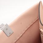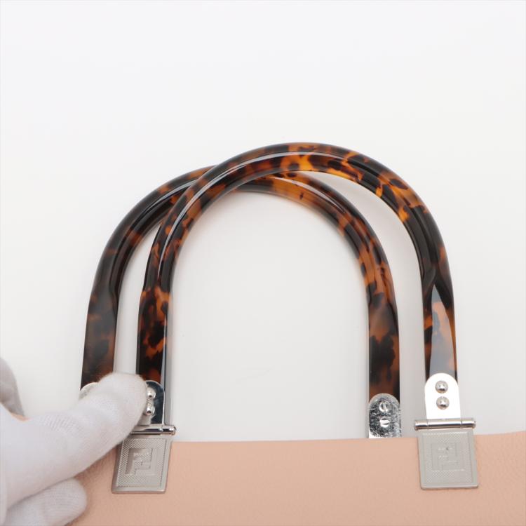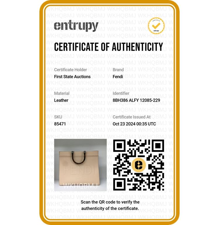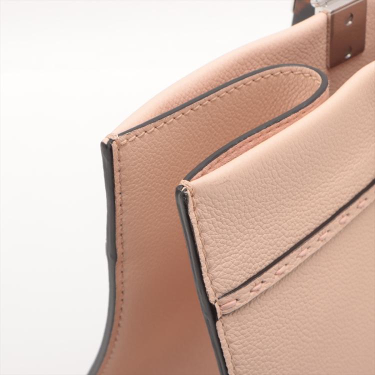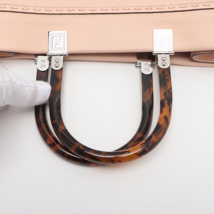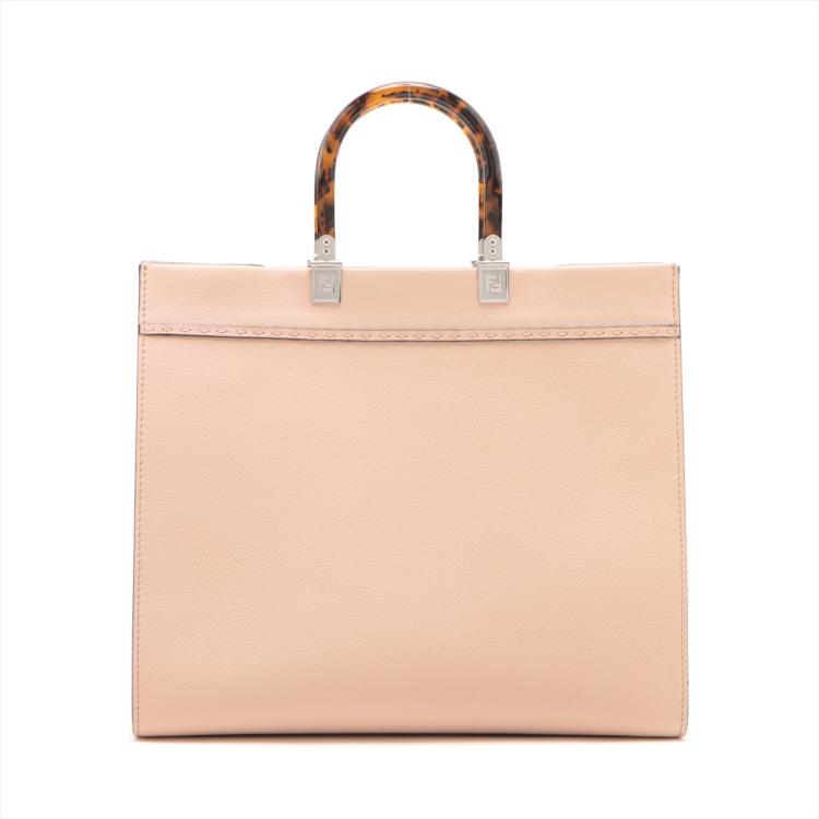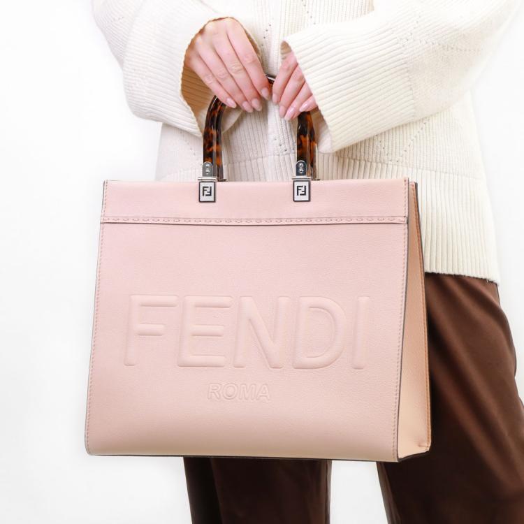 Fendi medium Sunshine tote bag in light pink grainy calfskin leather. Featuring an embossed Fendi logo at front, dual tortoiseshell top handles, detachable shoulder strap, and silver-toned hardware. The top opens to a colour matching pink microfibre interior. Approximate dimensions: 35cm(L) x 31cm(H) x 15cm(D), handle drop 11cm, strap drop 41.5cm. With Entrupy Certificate of Authenticity. (Pre-owned)