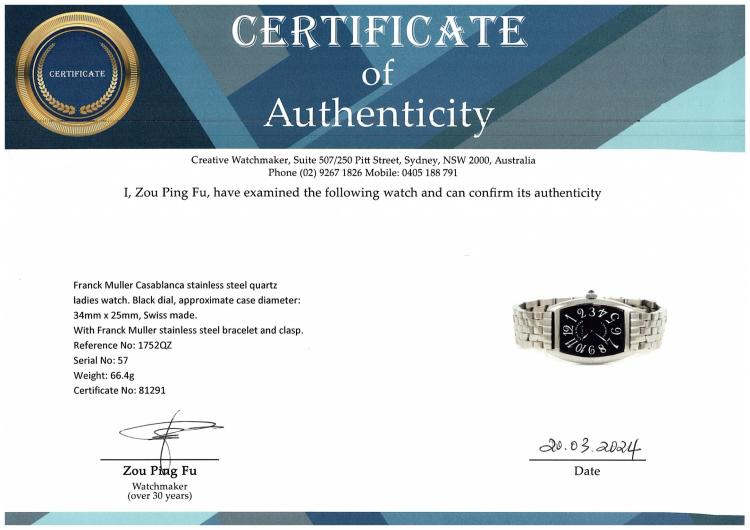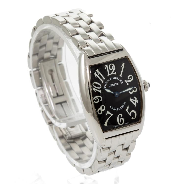 Franck Muller Casablanca stainless steel quartz ladies watch. Black dial, approximate case diameter: 34mm x 25mm, wrist size: 15.5cm, Swiss made. Ref# 1752 QZ C. With Franck Muller stainless steel bracelet and clasp. With Certificate of Authenticity, Undated Franck Muller Certificate of Origin & Warranty and Franck Muller box. 3 month FSA warranty (Pre-owned)