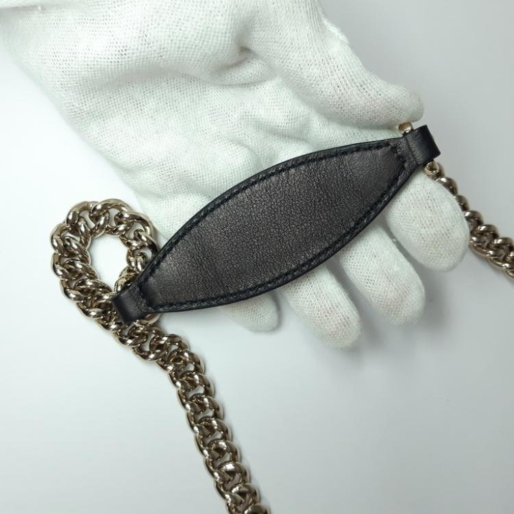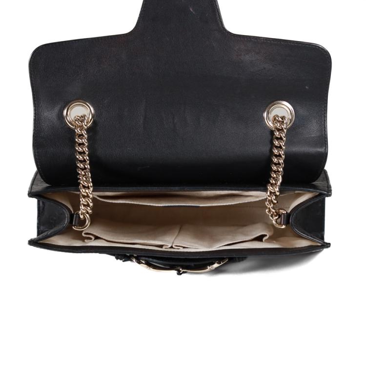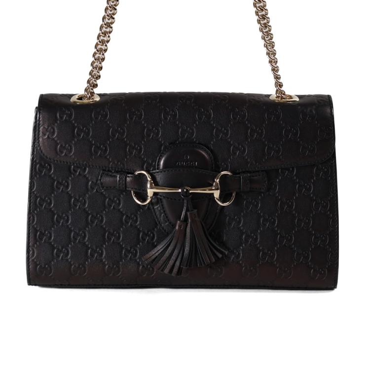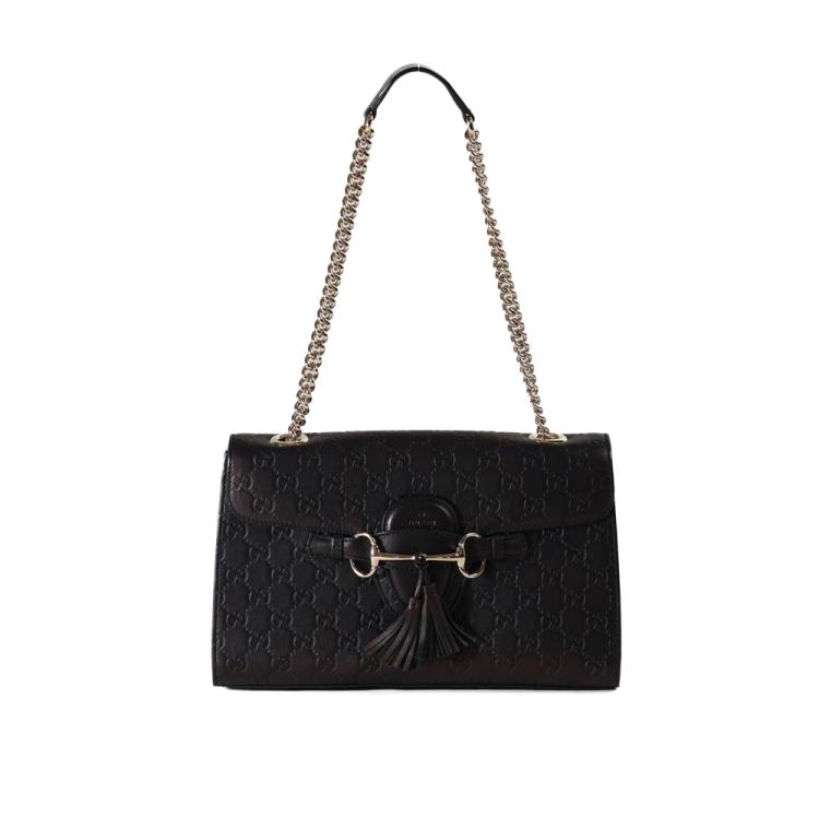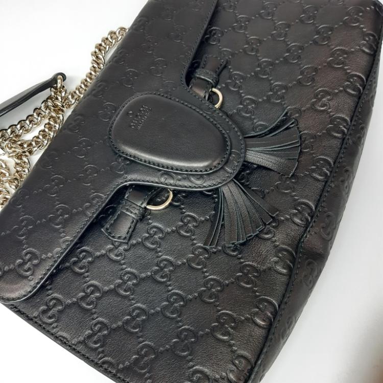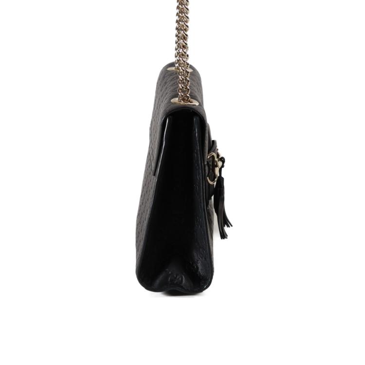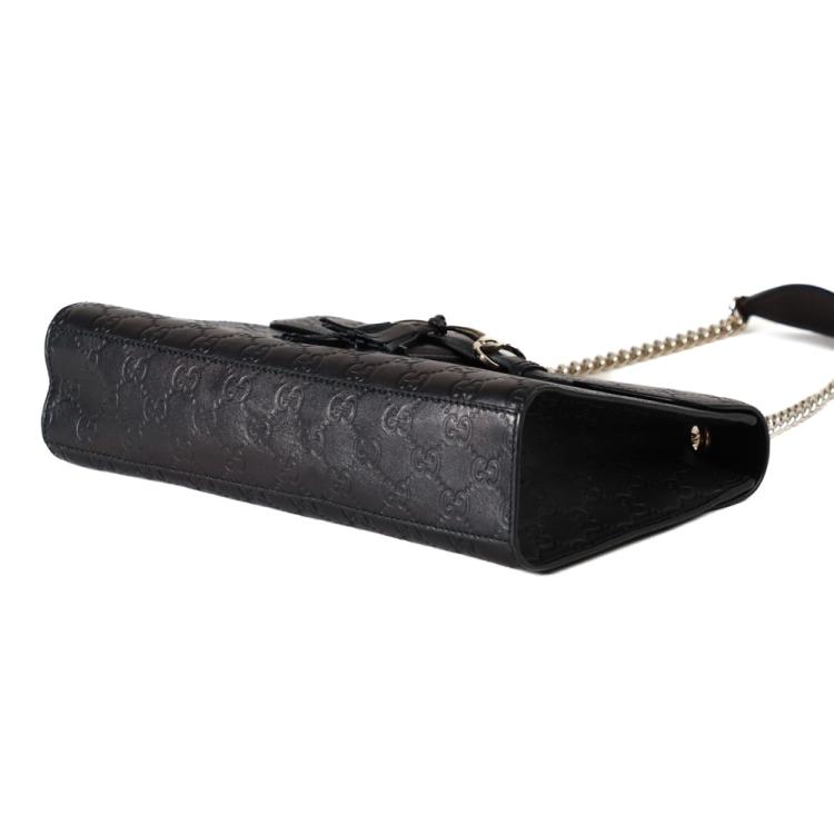 Gucci Guccissima medium Emily chain bag in black monogram GG-embossed leather. Featuring light gold-toned hardware, signature "Horsebit" embellishment, and single chain shoulder strap. Frontal flap opens to a beige textile interior with three patch pockets. Approximate dimensions: 30cm(Base-L) x 18cm(H) x 7.5cm(D), strap drop 26cm. Accompanied by Gucci dustbag. With Entrupy Certificate of Authenticity. (Pre-owned)