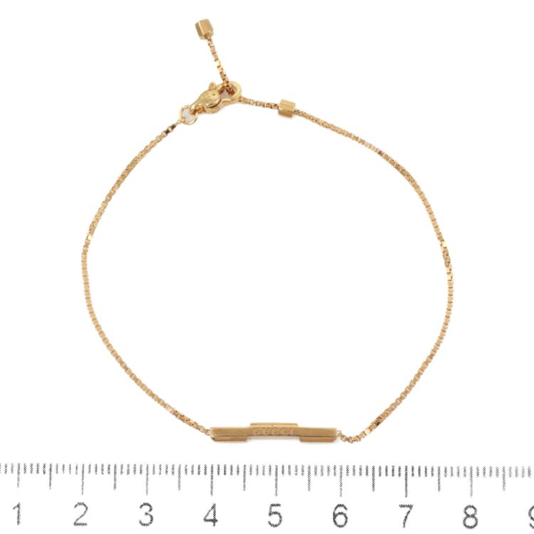 Gucci Link to Love bracelet with a bar engraved "Gucci". Bar length: 19.6mm. 18ct yellow gold. Made in Italy. Adjustable Length: 17.0cm - 19.0cm. Weight: 3.7g. (Pre-owned)