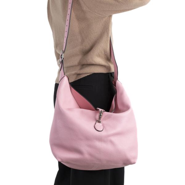 Gucci medium 1961 Jackie shoulder bag in sugar pink calfskin leather. Featuring silver-toned hardware and adjustable shoulder strap. The signaure piston closure opens to a pink leather suede lining interior. Approximate dimensions: 34cm(L) x 38cm(H) x 28cm(D), 51cm shoulder height, adjustable. Accompanied by a Gucci dustbag and matching removable leather pouch. With Entrupy Certificate of Authenticity. (Pre-owned)