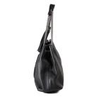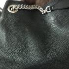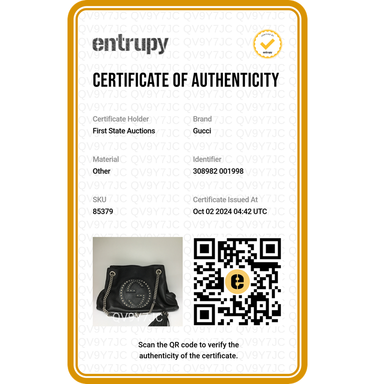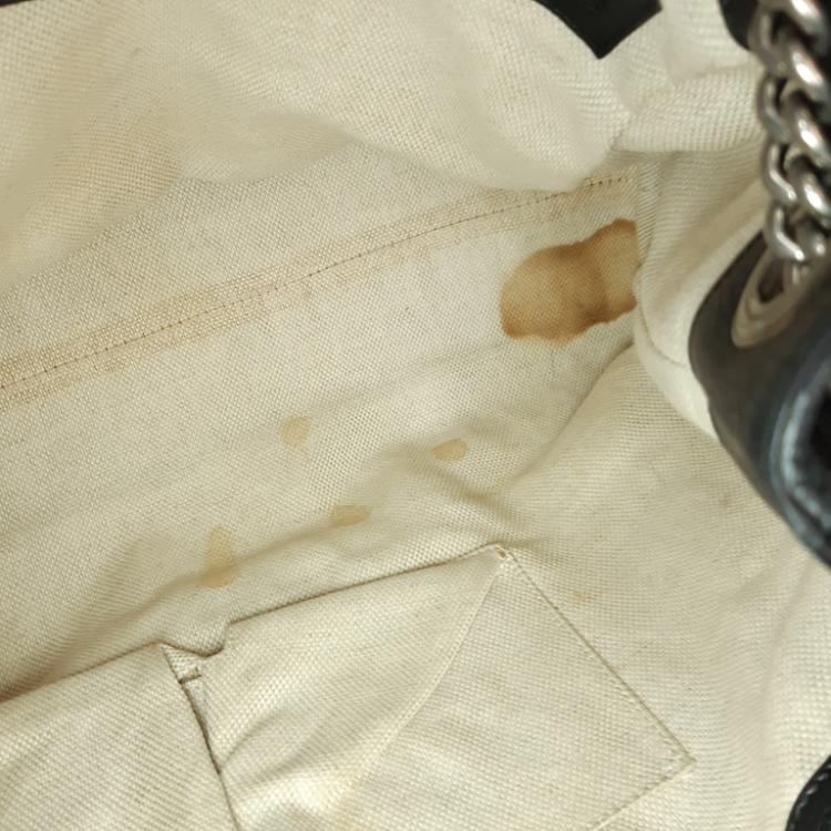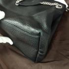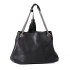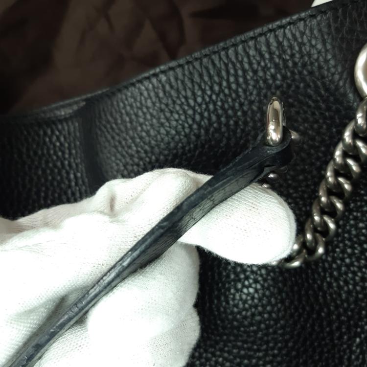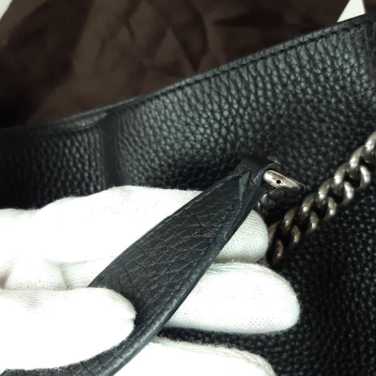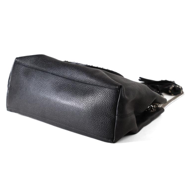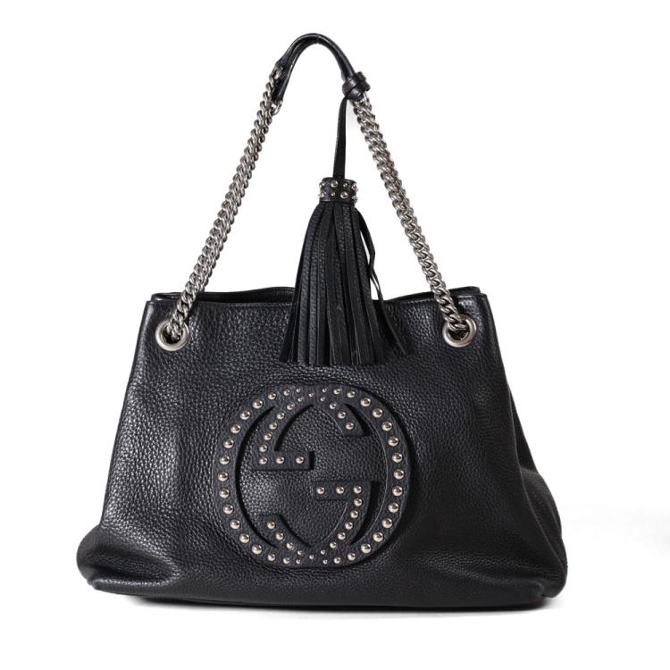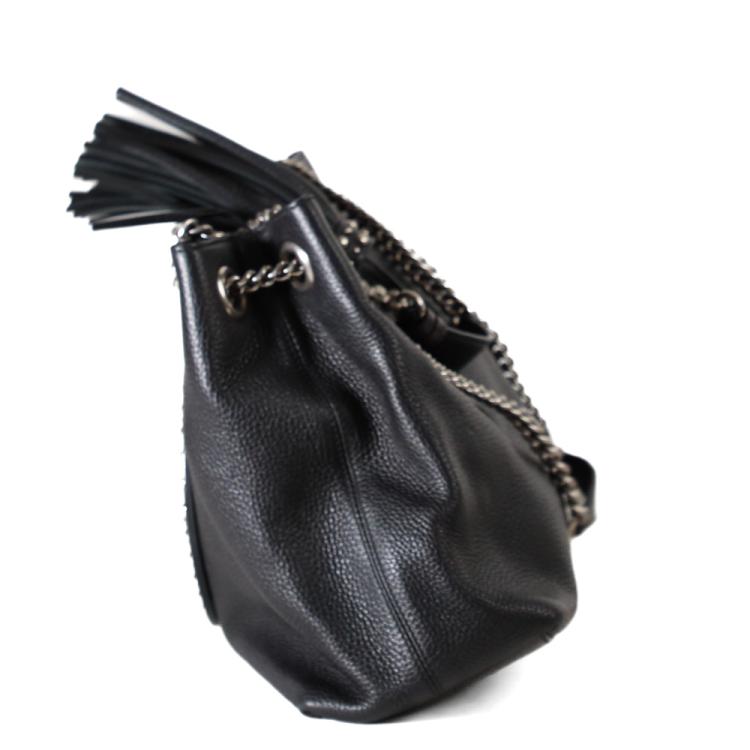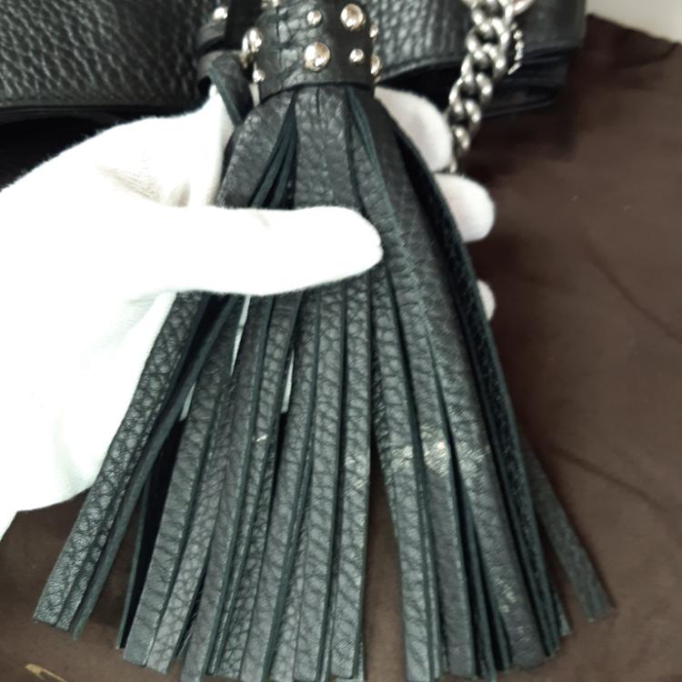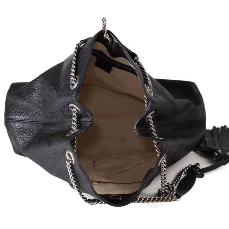 Gucci Soho medium shoulder bag in black calfskin leather. Featuring silver-toned hardware, embossed interlocking G with studs, and detachable leather tassel. The hook closure opens to a beige textile interior with a zipper and patch pockets. Approximate dimensions: 38cm(L) x 27cm(H) x 14cm(D), double chain shoulder strap drop 18cm. Accompanied by Gucci dustbag. With Entrupy Certificate of Authenticity. (Pre-owned)