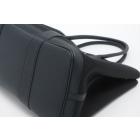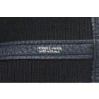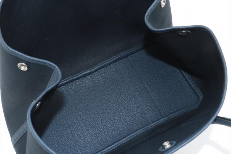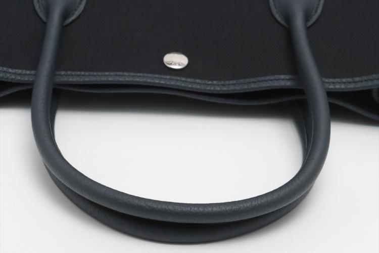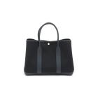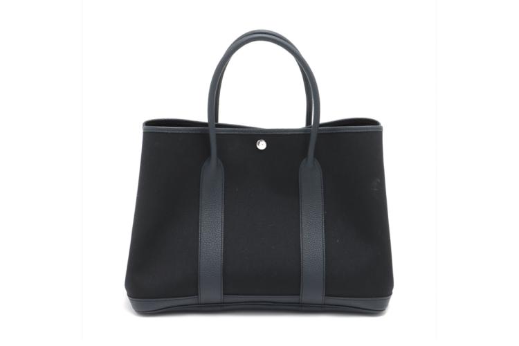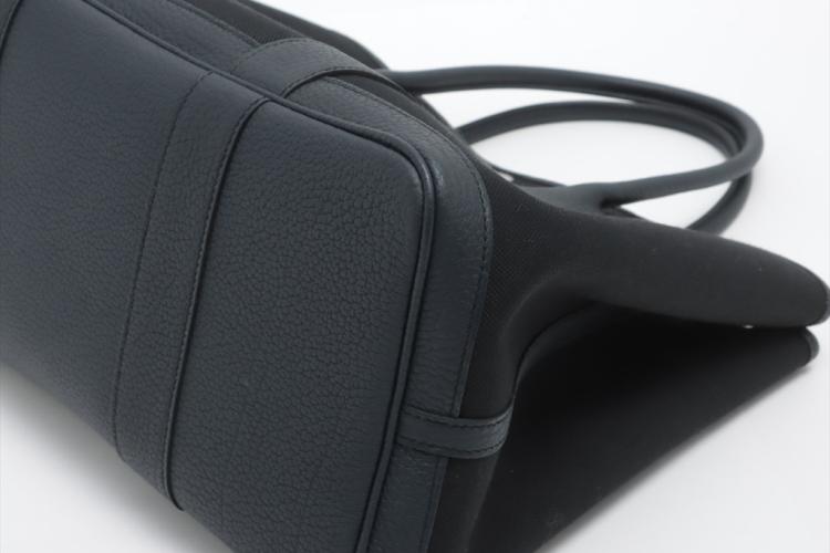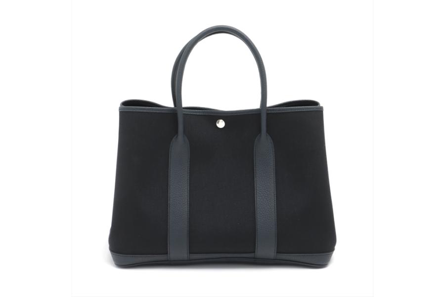 Hermès Garden Party 36 MM in navy blue Negonda leather and black Toile canvas ("Y", circa: 2020). The bag has rolled leather handles and is fitted with silver palladium hardware, featuring a monogram snap-button closure. The bag opens to a black fabric interior with a navy leather base to match its exterior. Approximate dimensions: 36cm(L) x 27cm(H) x 17.5cm(D). Accompanied with a Hermes dustbag. With Entrupy Certificate of Authenticity. (Pre-owned)