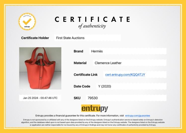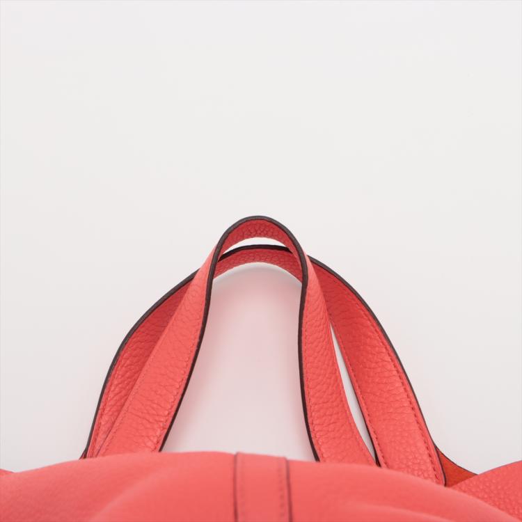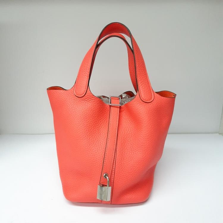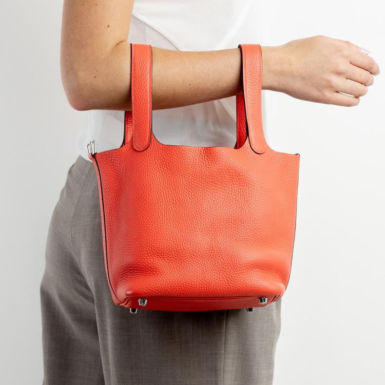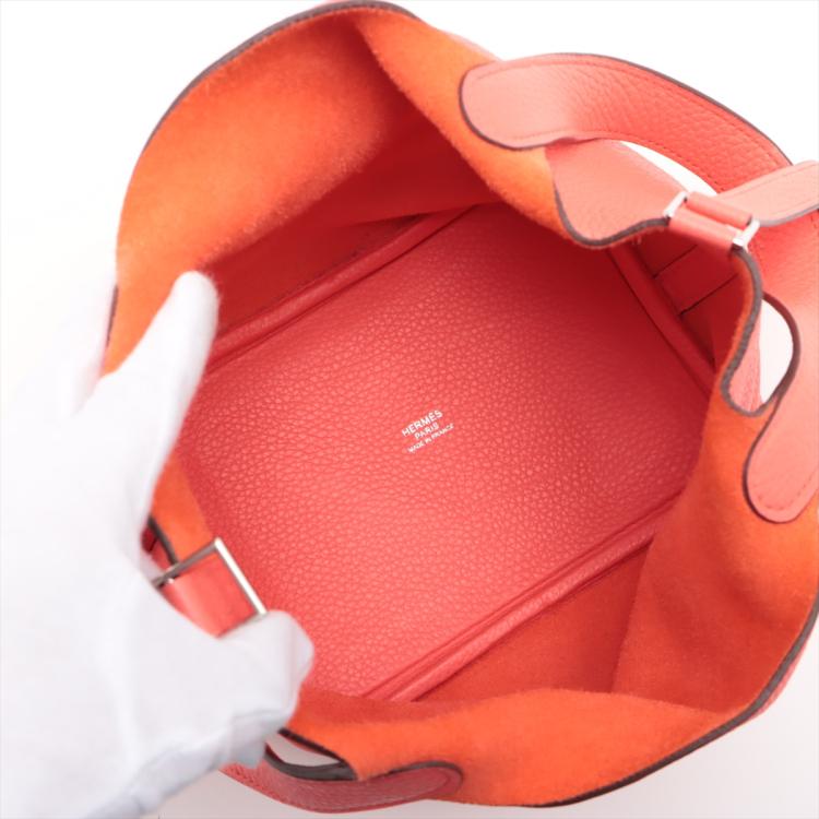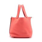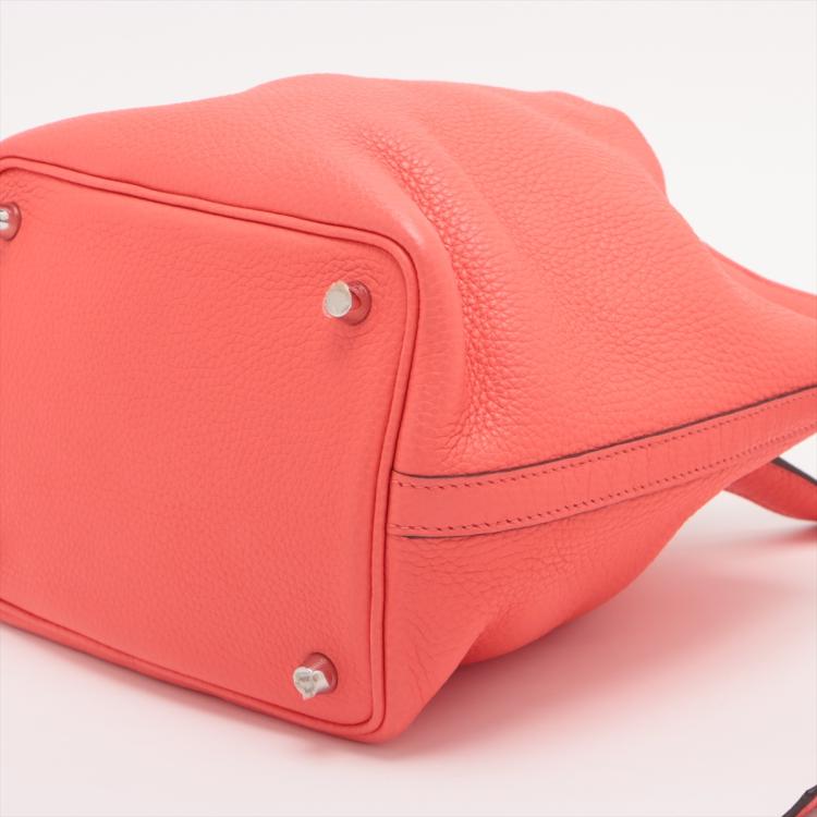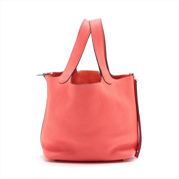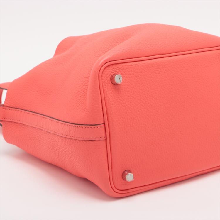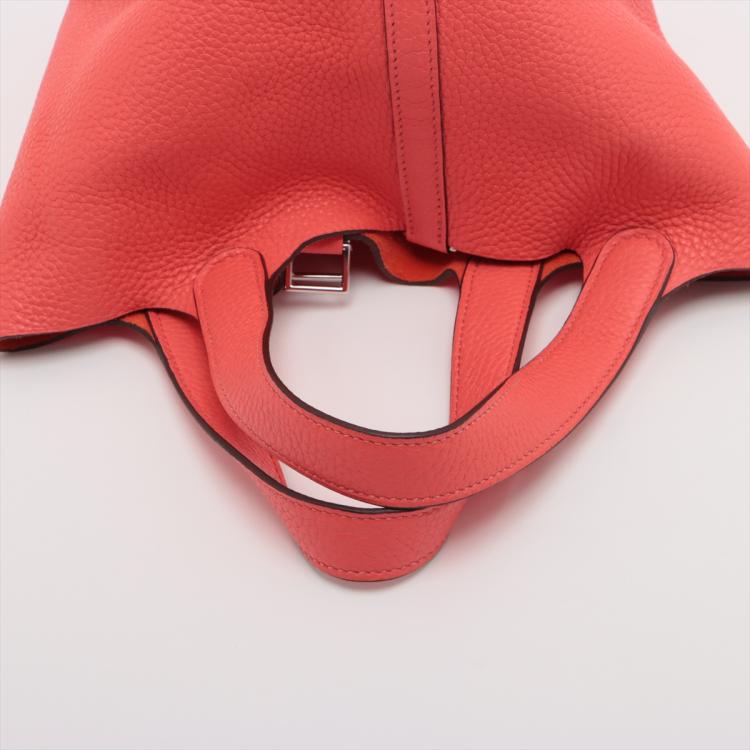 Hermes Picotin Lock PM 18 in Taurillon Clemence in Rose Texas colour ("Y" stamp, 2020). Featuring silver toned hardware, leather top handles, opening top with strap closure. The top opens to a suede lining interior with leather bottom. Approximate dimensions: 18cm(L) x 18cm(H) x 13.5cm(D), 13cm handle drop. Accompanied by Hermes padlock, one key and a small dust bag for lock & key. With Entrupy Certificate of Authenticity. (Pre-owned)