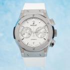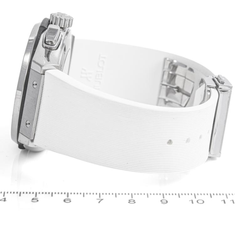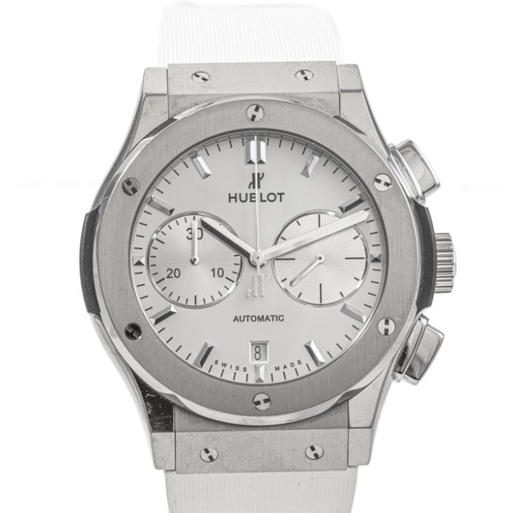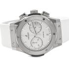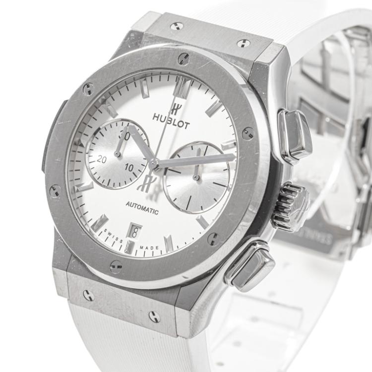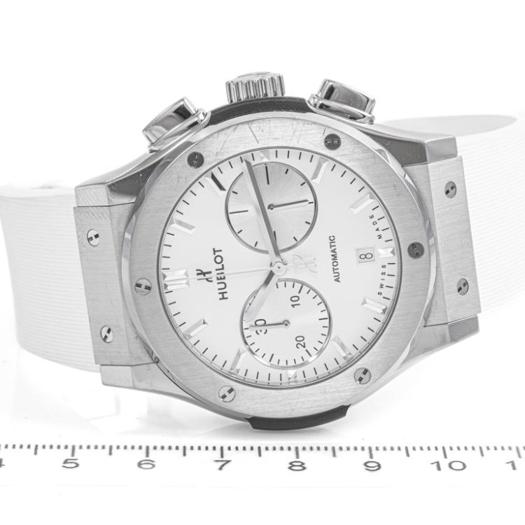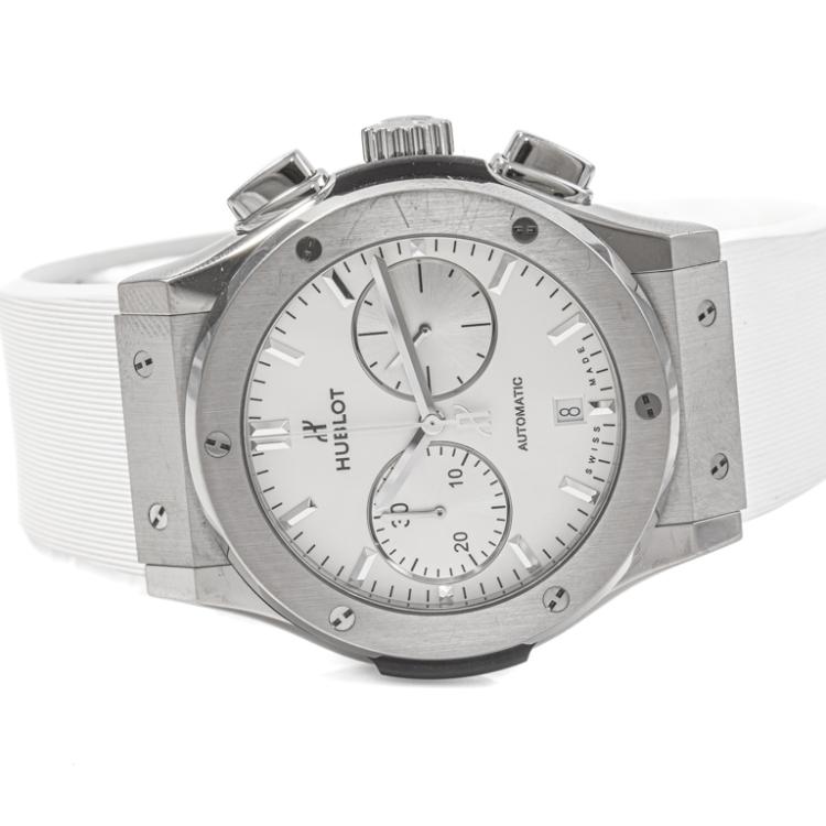 Hublot Classic Fusion titanium automatic mens watch. White chronograph dial, date, case diameter: 45mm, adjustable max wrist size: 19.5cm, Swiss made. Ref# 521.NX.2611.LR. With Hublot white rubber strap and clasp. With Certificate of Authenticity and Hublot case. 3 month FSA warranty. (Pre-owned)