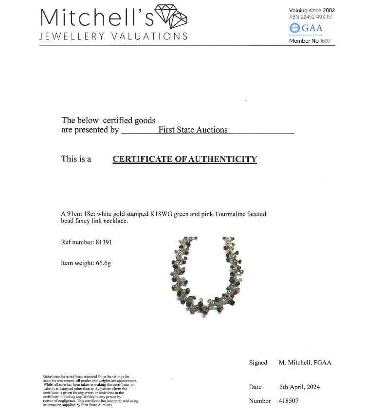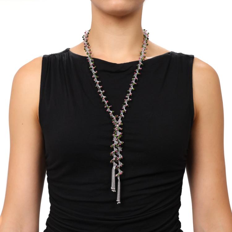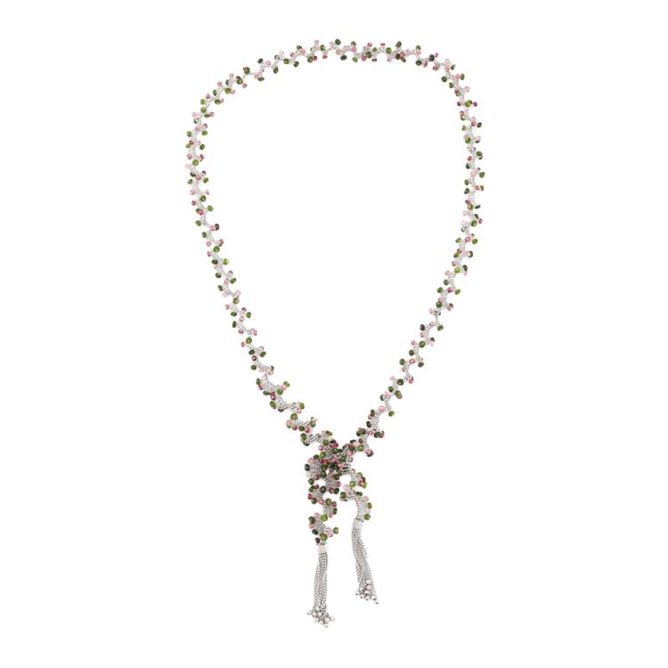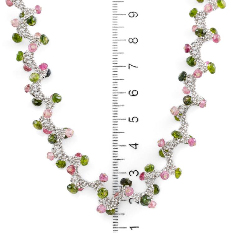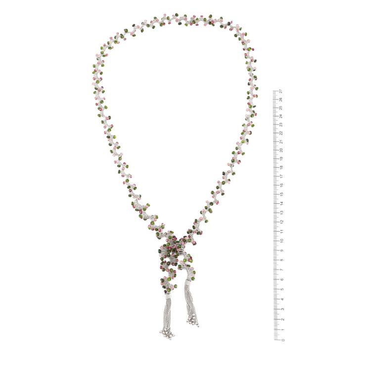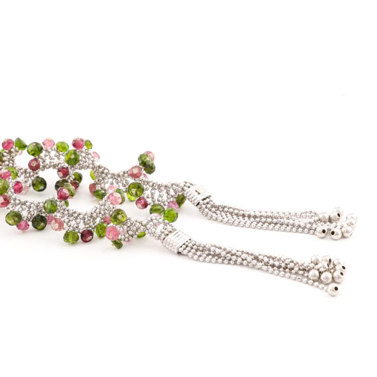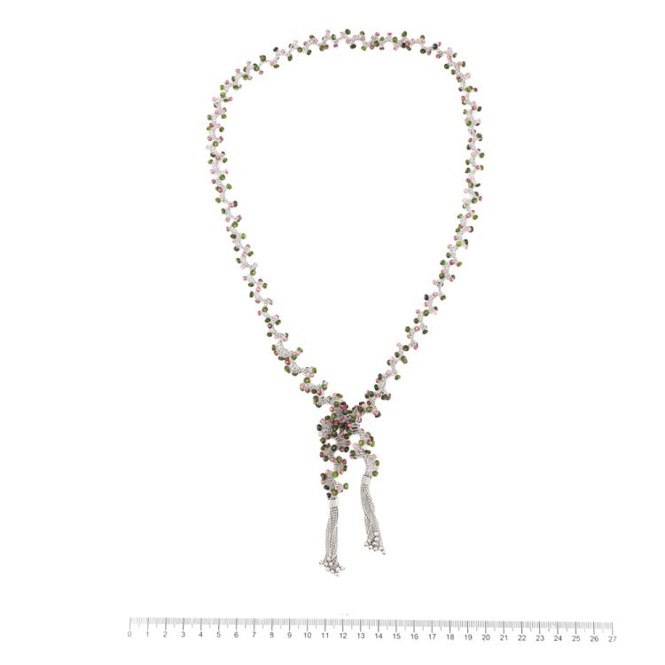 Lariat necklace with natural pink & green faceted Tourmaline beads of approximately size 3.00 - 4.00mm. 18ct white gold. Length: 91cm. Weight: 66.6g. With copy of Certificate #418507. (Pre-owned)