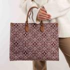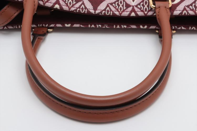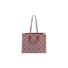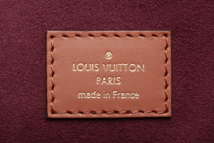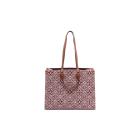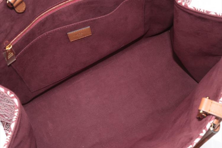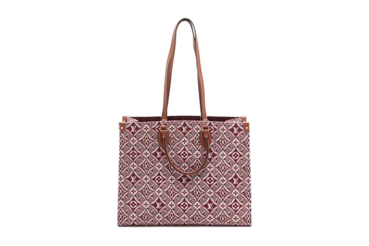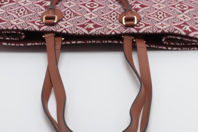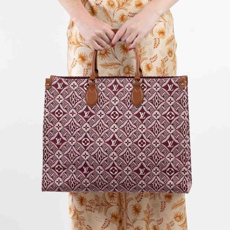 Louis Vuitton Onthego GM tote in the Bordeaux 'Since 1984' Jacquard fabric. With a brown leather shoulder strap and rolled top handles, and gold-toned metal accents. The burgundy microfibre interior is sealed with a clasp-hook closure and contains zipper and patch pockets. Approximate dimensions: 41cm(L) x 31.5cm(H) 16cm(D). With Entrupy Certificate of Authenticity. (Pre-owned)