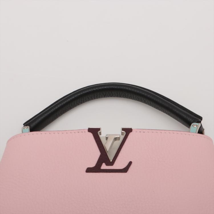 Louis Vuitton Capucines BB in light pink and white Taurillon leather. Featuring silver-toned hardware, leather-wrapped LV initials, and single black leather handle. The flap and hook closure open to a burgundy leather interior with two compartments and a zipper pocket. Approximate dimensions: 26cm(L) x 18cm(H) x 9cm(D), handle drop 7cm, adjustable and detachable strap 51cm. With Entrupy Certificate of Authenticity. (Pre-owned)