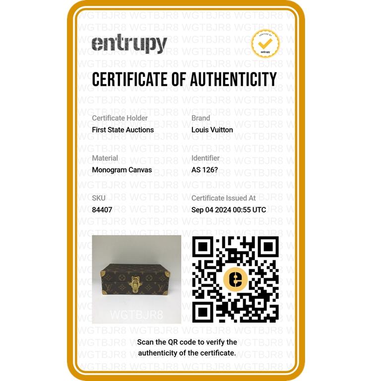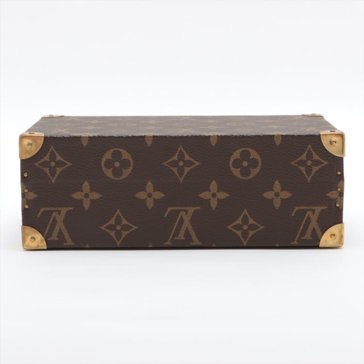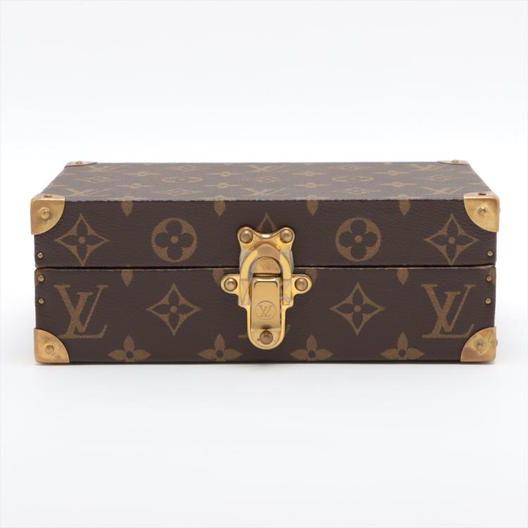 Louis Vuitton Coffret Polyvalent trunk case in Monogram coated canvas. Featuring antique gold-tone hardware, antique brass corner plates. Frontal lock closure opens to a burgundy microfibre interior. Approximate dimensions: 20cm(L) x 7cm(H) x 12.5cm(D). With Entrupy Certificate of Authenticity. (Pre-owned)