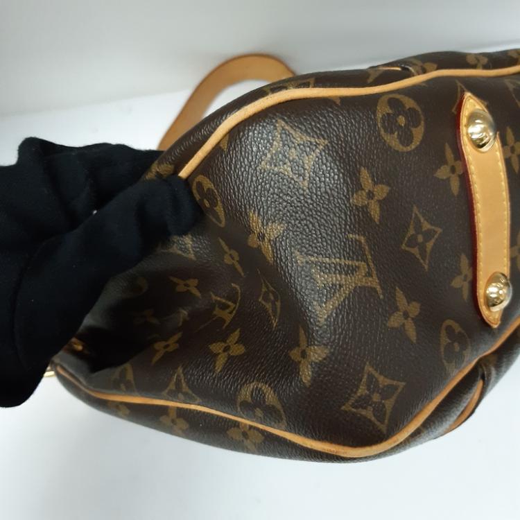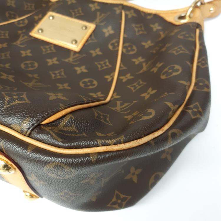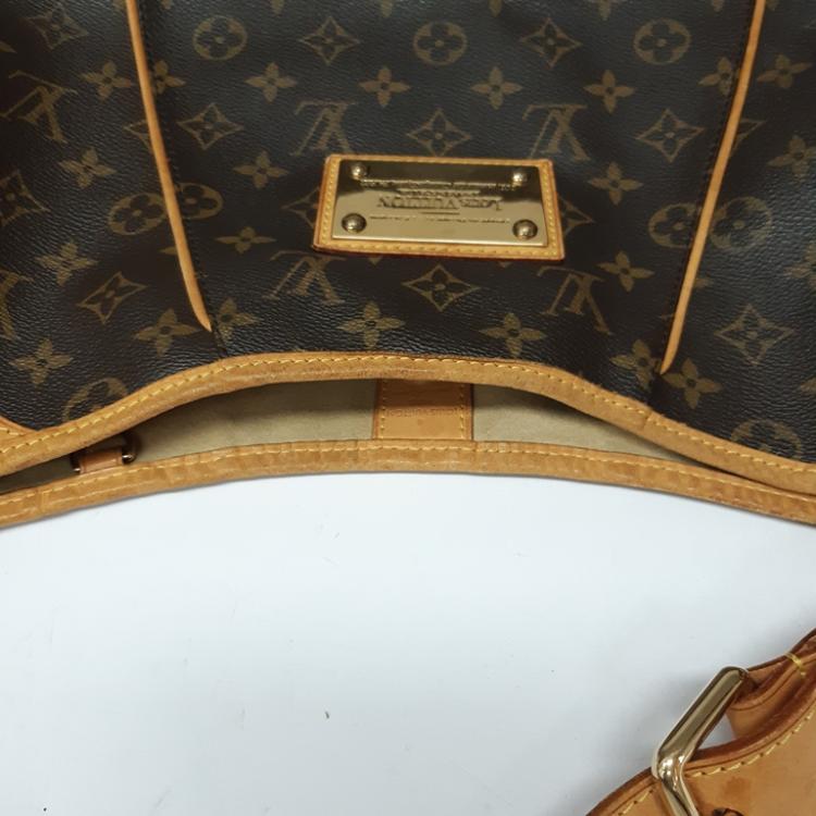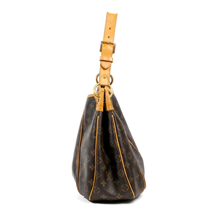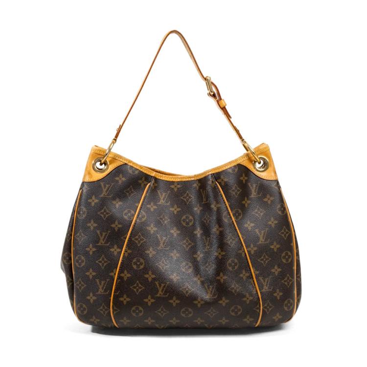 Louis Vuitton Galliera PM in Monogram coated canvas. Featuring gold-toned hardware, an adjustable flat leather shoulder strap, brown leather piping and trim, and a large engraved front metal plate. The top with a magnetic button opens to a light beige microfiber interior with pockets. Approximate dimensions: 37cm(L-base) x 30cm(H) x 13cm(D), 20cm shoulder drop. Accompanied by a LV dustbag. With Entrupy Certificate of Authenticity. (Pre-owned)