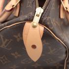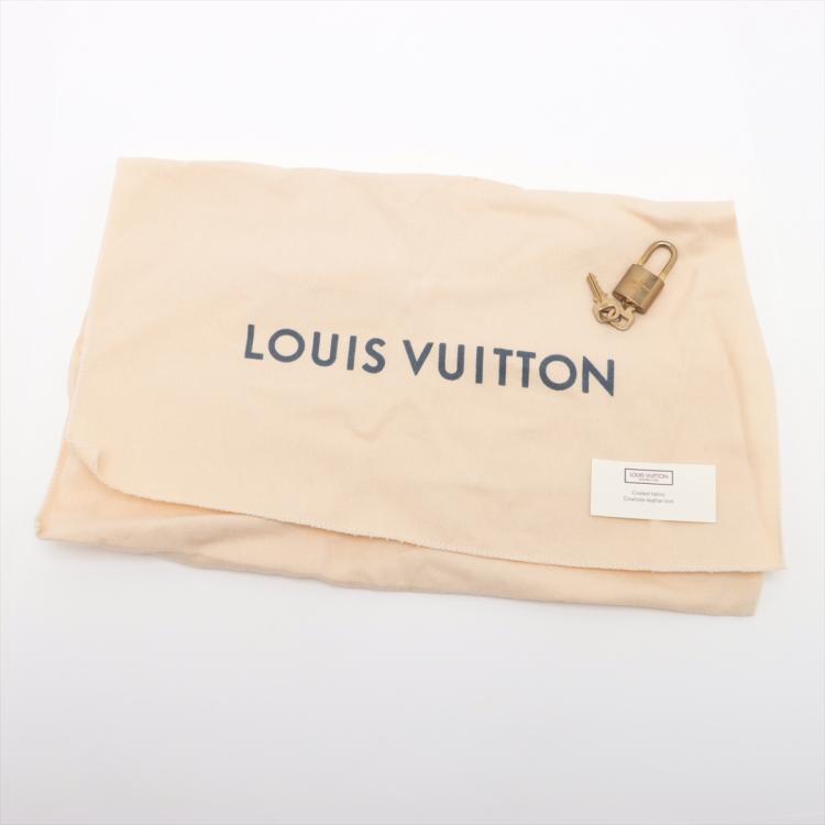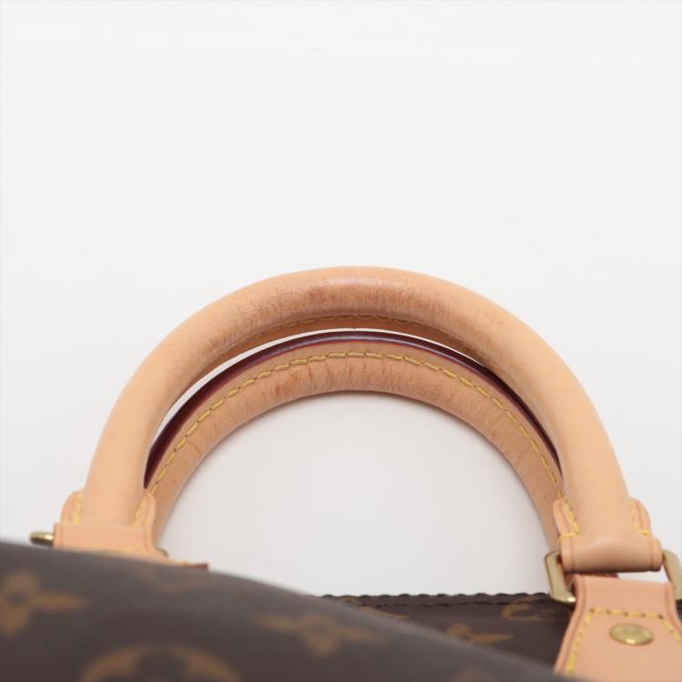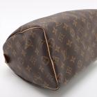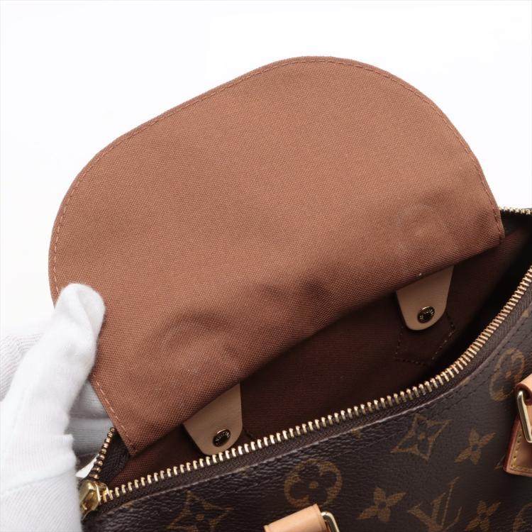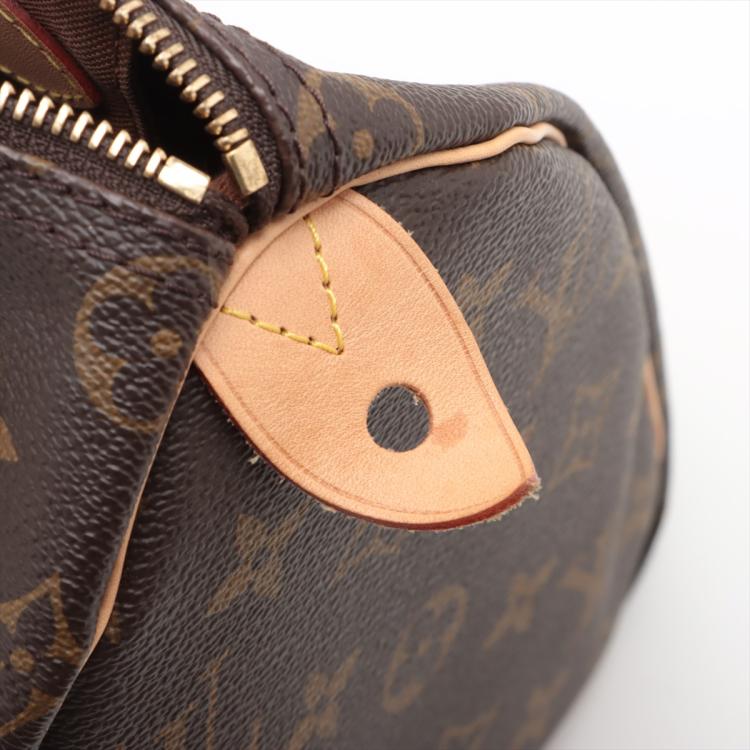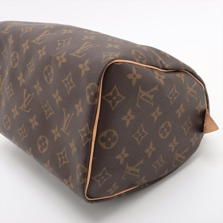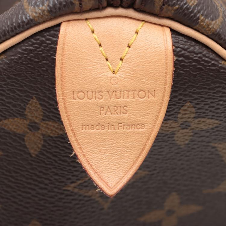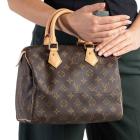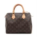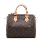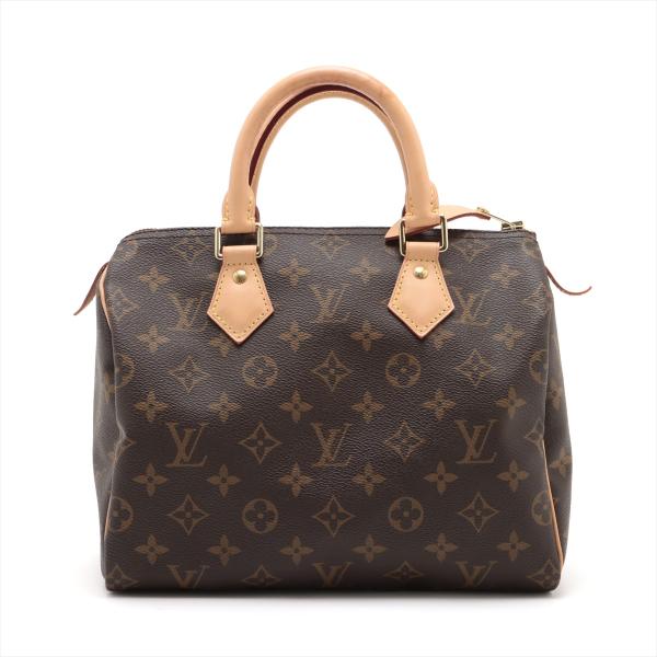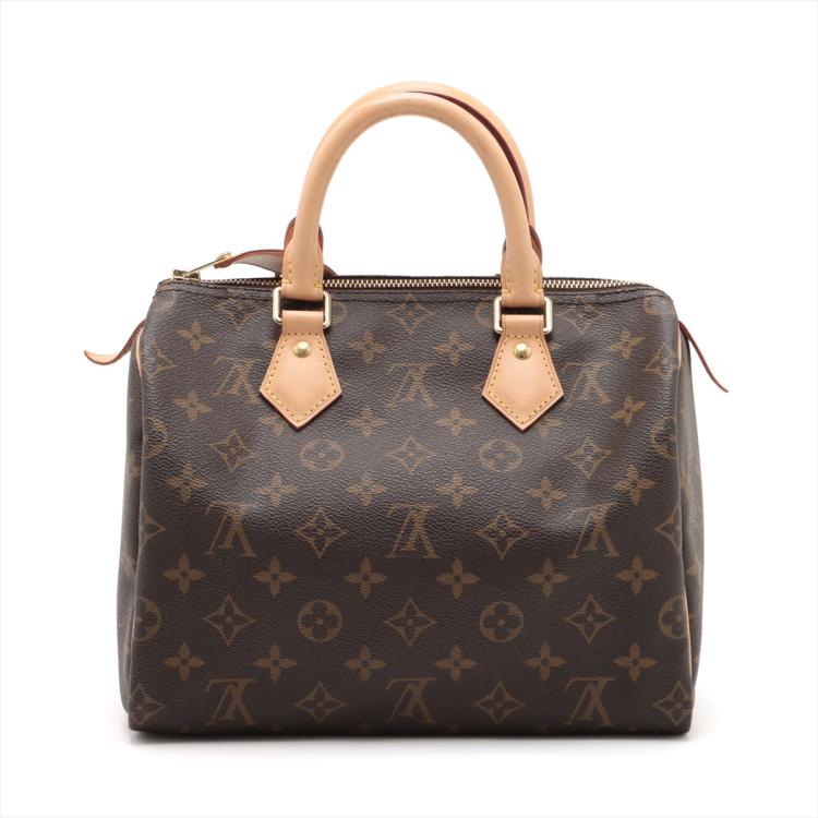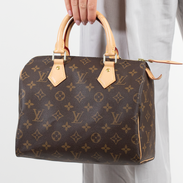 Louis Vuitton Speedy 25 in Monogram coated canvas. Featuring cowhide leather trims and top handles, gold-toned hardware, zip closure on top. The zip opens to a brown fabric lining interior with a hanging patch pocket. Approximate dimensions: 25.5cm(L) x 18.5cm(H) x14.5cm(D), 8.5cm handle drop. Accompanied by LV padlock, keys and dust bag. (Note: NO shoulder strap version). With Entrupy Certificate of Authenticity. (Pre-owned)