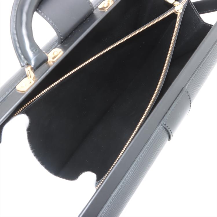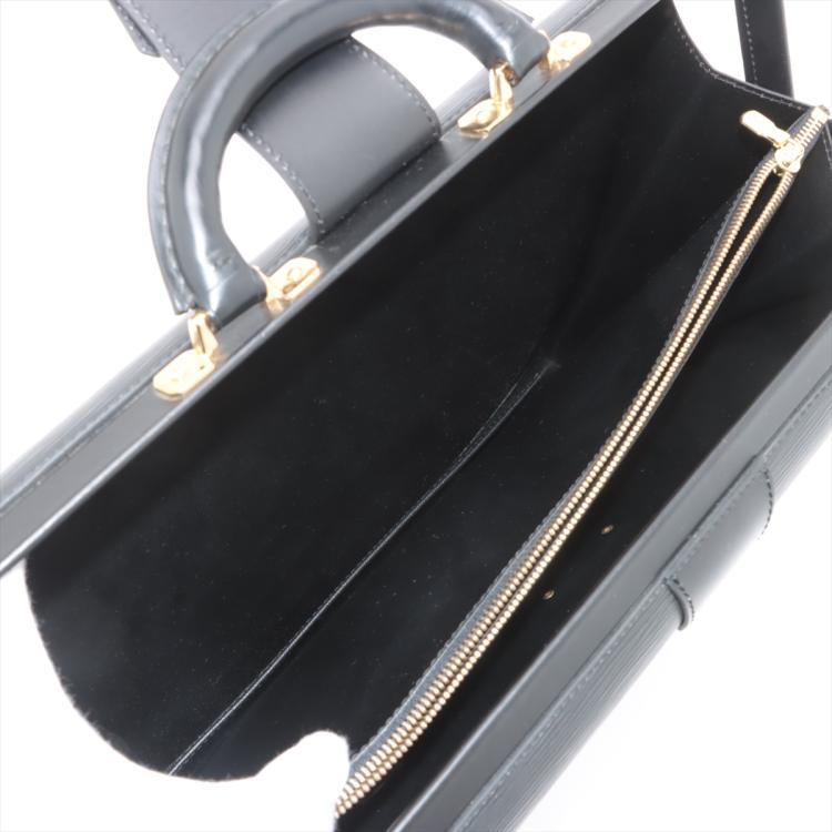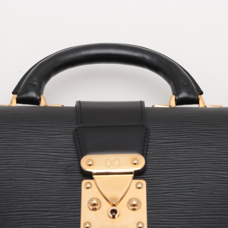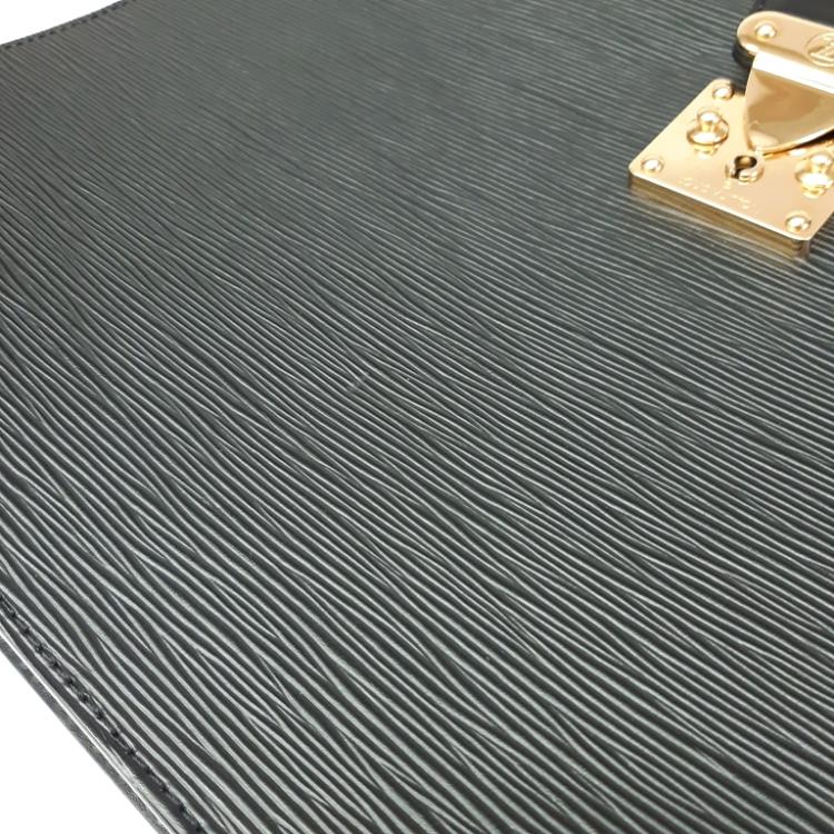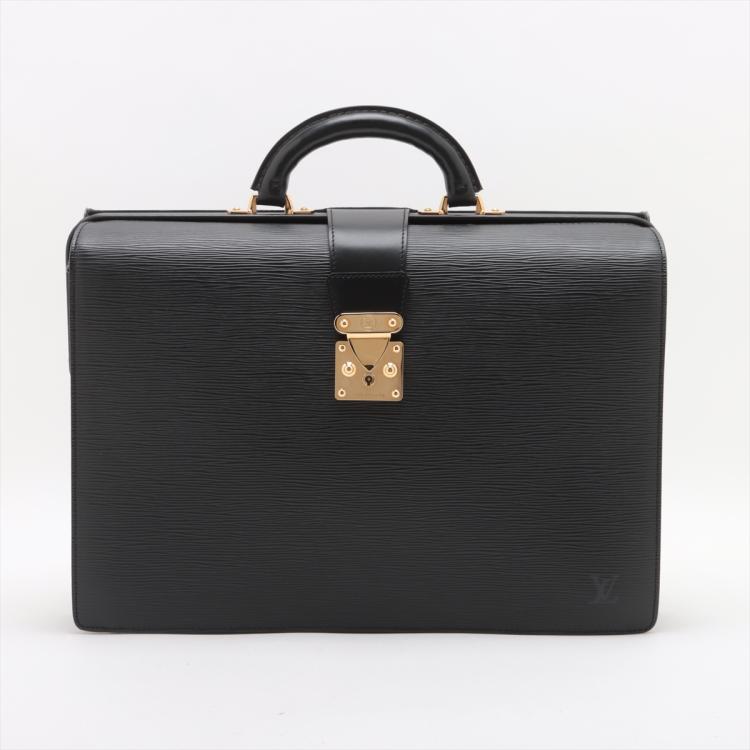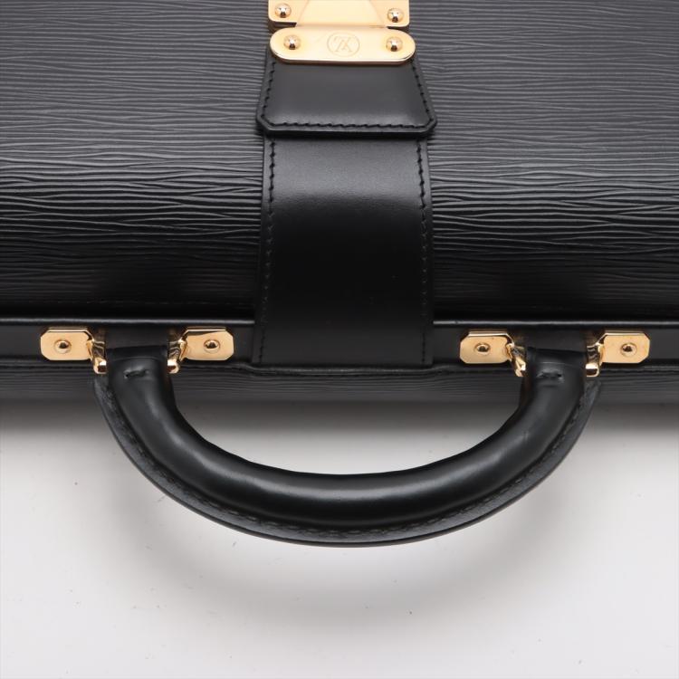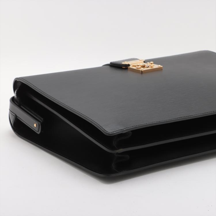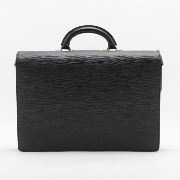 Louis Vuitton Serviette Fermoir briefcase in black Epi leather. Featuring gold-tone hardware, single leather handle. The flip over wide strip with push-lock closure opens to black leather interior with 2 compartments separated by a center zipper pocket. Approximate dimensions: 41cm(W) x 29cm(H) x 12cm(D), 5cm handle drop. Accompanied by 2 keys and a LV dustbag With Entrupy Certificate of Authenticity. (Pre-owned)