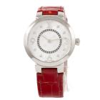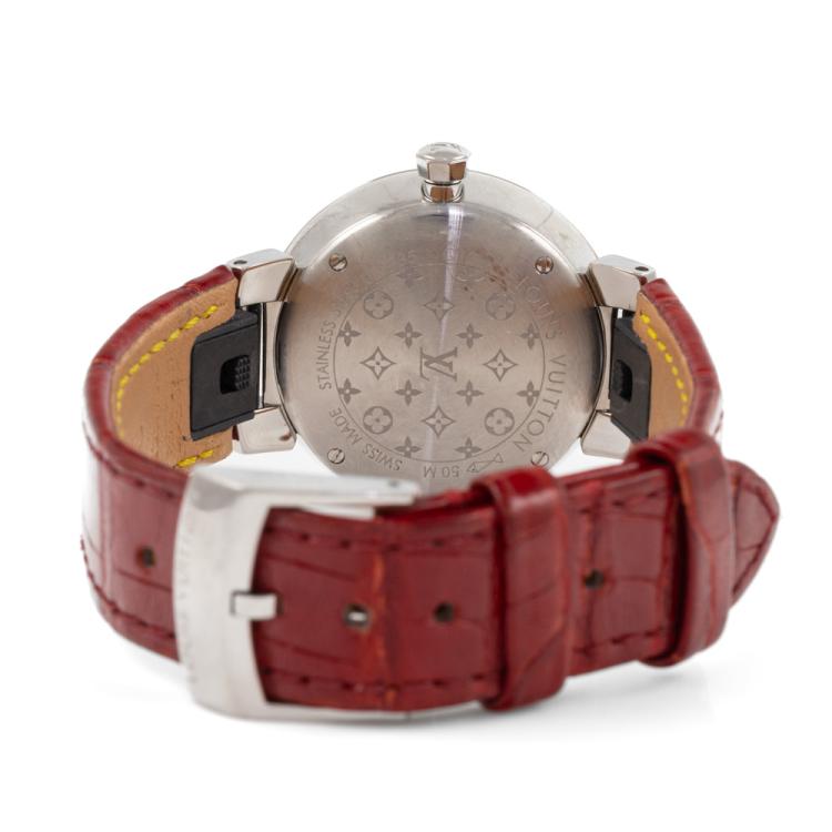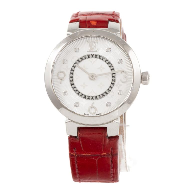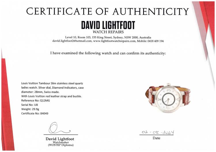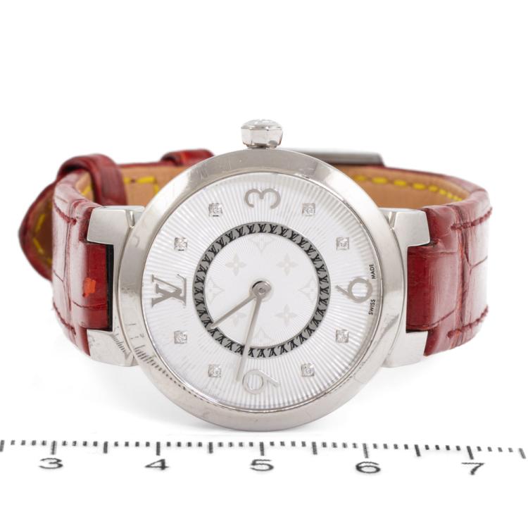 Louis Vuitton Tambour Slim stainless steel quartz ladies watch. Silver dial, Diamond Indicators, case diameter: 28mm, strap length: 17.5cm, Swiss made. Ref# Q12MG. With Louis Vuitton red leather strap and buckle. With Certificate of Authenticity and Louis Vuitton pouch. 3 month FSA warranty (Pre-owned)