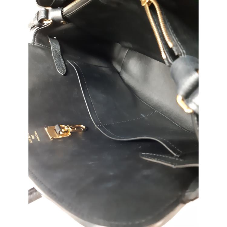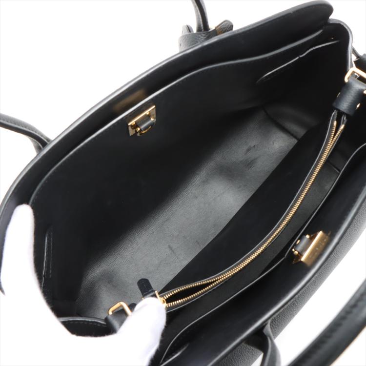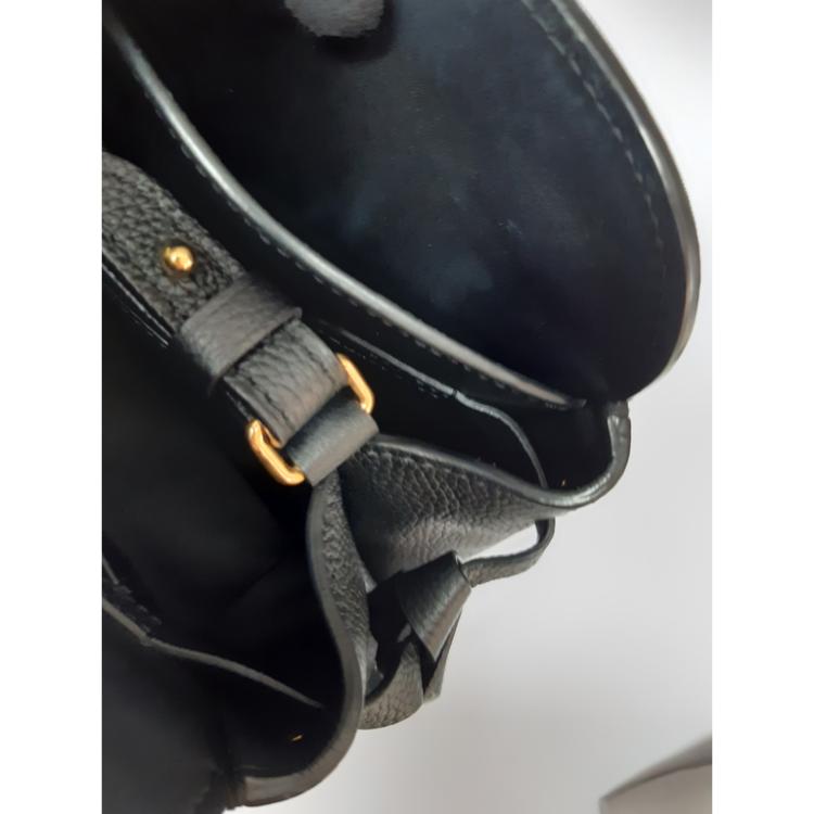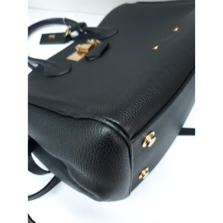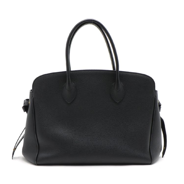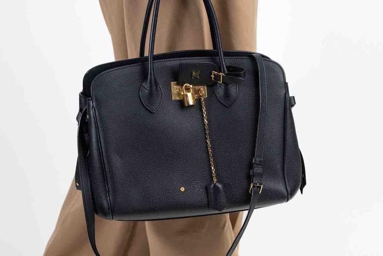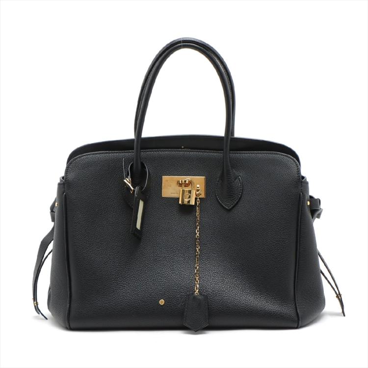 Louis Vuitton Milla MM in black grained calfskin. The bag features gold tone hardware, rolled top handles, shoulder strap and side bows, turn-lock closure at front. The top opens to two leather lining compartments divided by the centre zipped pocket. Approximate dimensions: 30cm(L) x 25cm(H) x 16cm(D), 14.5cm handle drop and 40cm strap drop. Accompanied by padlock, crochet with keys, name tag, LV dustbag & box. With Entrupy Certificate of Authenticity. (Pre-owned)