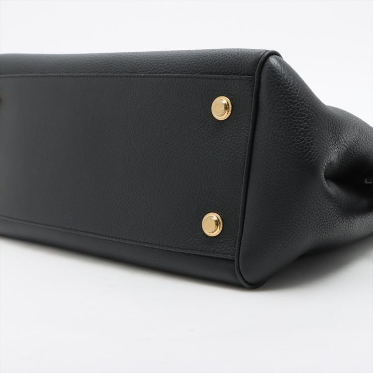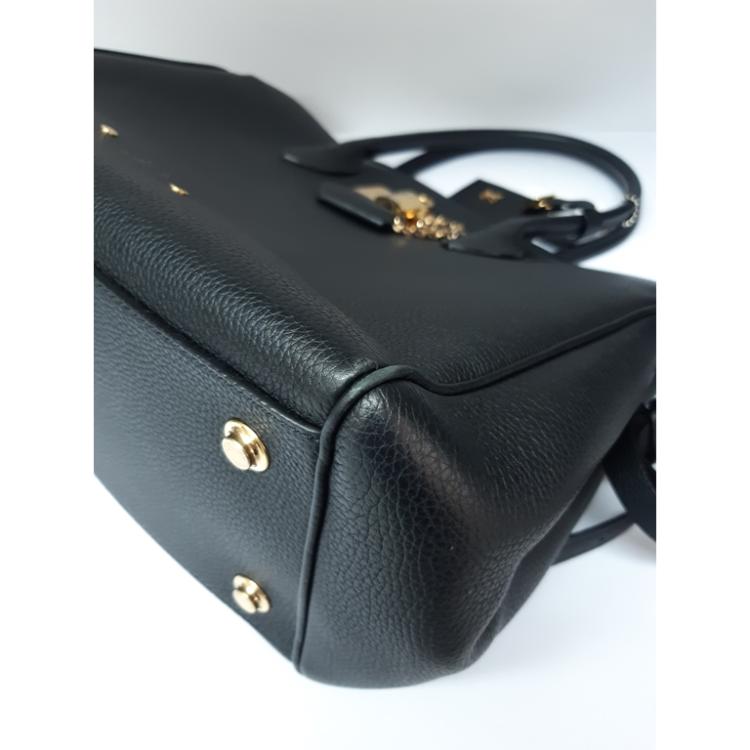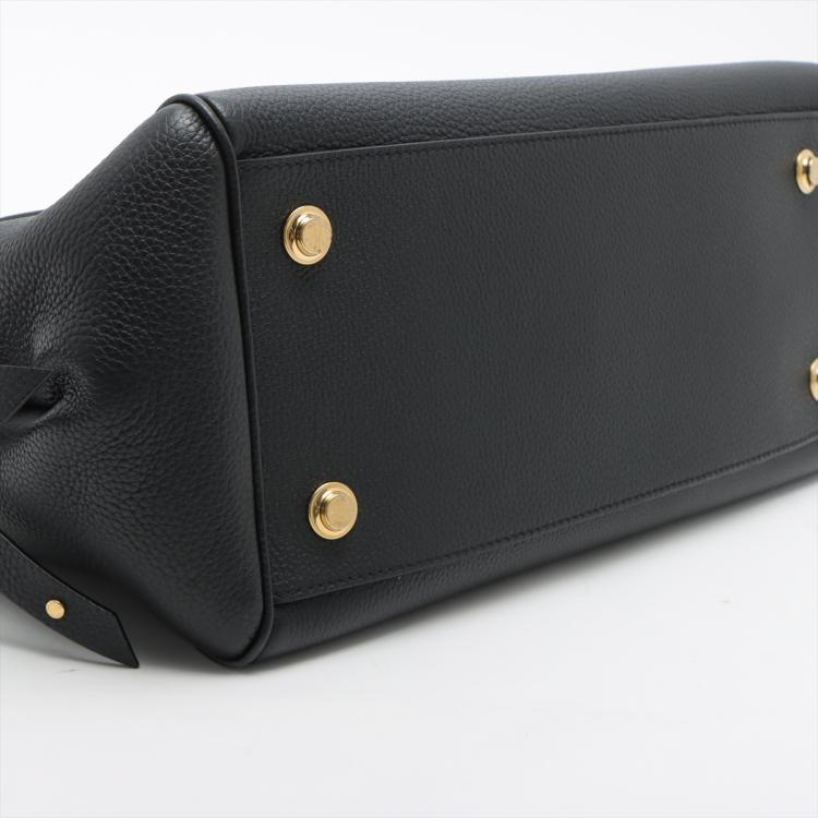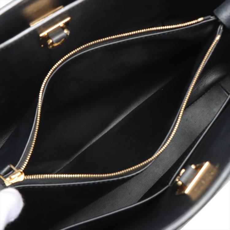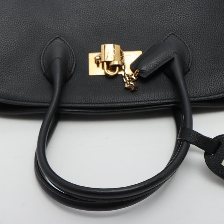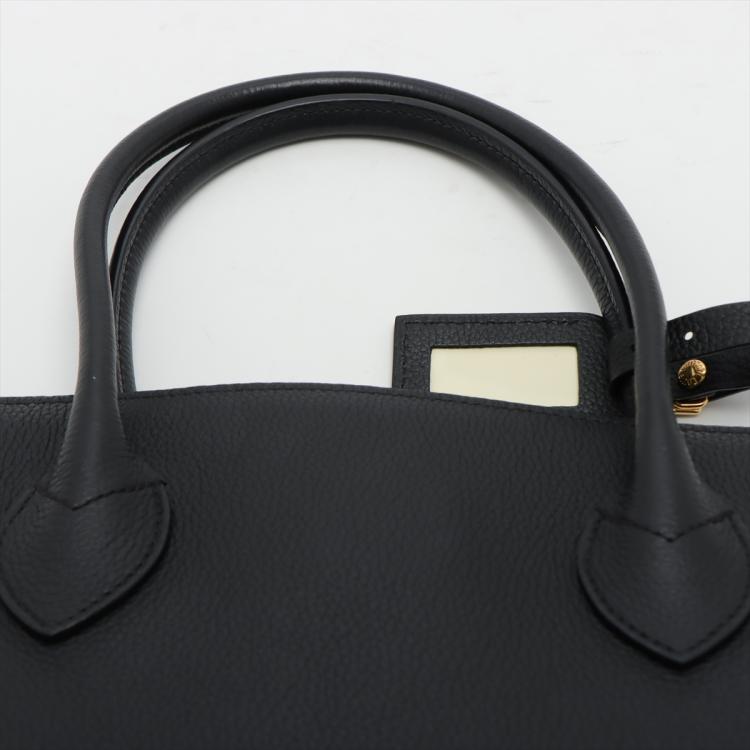 Louis Vuitton Milla MM in black grained calfskin. The bag features gold tone hardware, rolled top handles, shoulder strap and side bows, turn-lock closure at front. The top opens to two leather lining compartments divided by the centre zipped pocket. Approximate dimensions: 30cm(L) x 25cm(H) x 16cm(D), 14.5cm handle drop and 40cm strap drop. Accompanied by padlock, crochet with keys, name tag, LV dustbag & box. With Entrupy Certificate of Authenticity. (Pre-owned)
