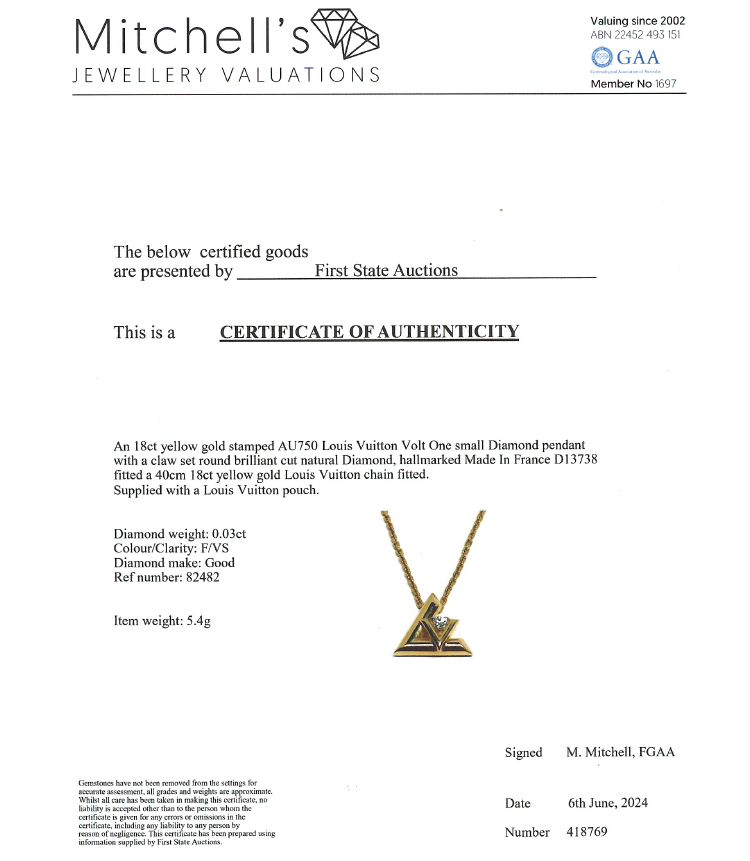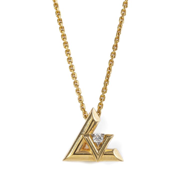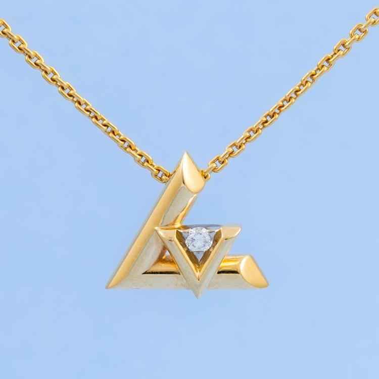 Louis Vuitton Volt One small pendant with a round Natural Diamond of 0.03ct. Motif size: 12mm. 18ct yellow gold with 40cm 18ct yellow gold chain. Made in France. Weight: 5.4g. With Louis Vuitton pouch. With Certificate #418769. (Pre-owned)