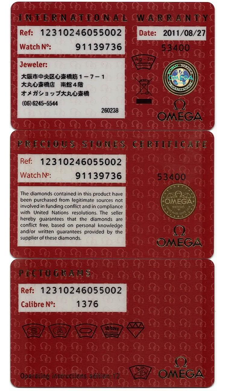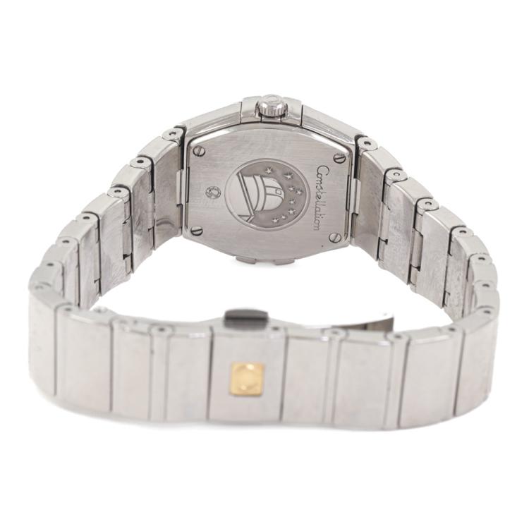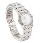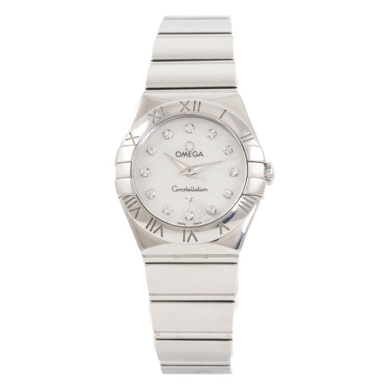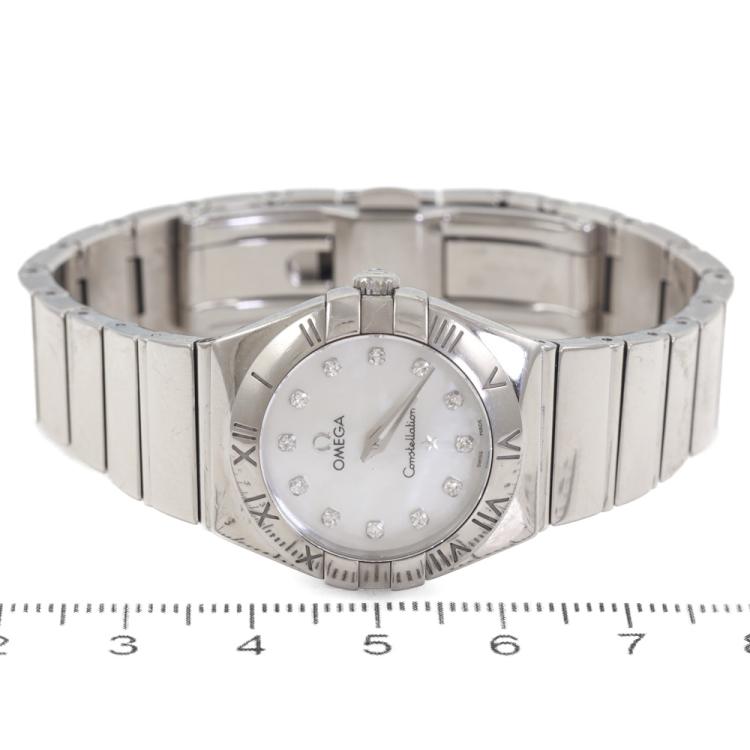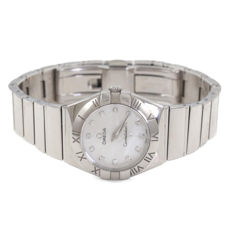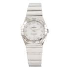 Omega Constellation stainless steel quartz ladies watch. Mother of Pearl dial, Diamond indicators, case diameter: 24mm, wrist size: 15.5cm, Swiss made. Ref# 123.10.24.60.55.002. With Omega stainless steel bracelet and clasp. With Certificate of Authenticity, Omega International warranty card dated 27/08/2011, Precious Stone card, Pictograms Card and Omega box. 3 month FSA warranty. (Pre-owned)