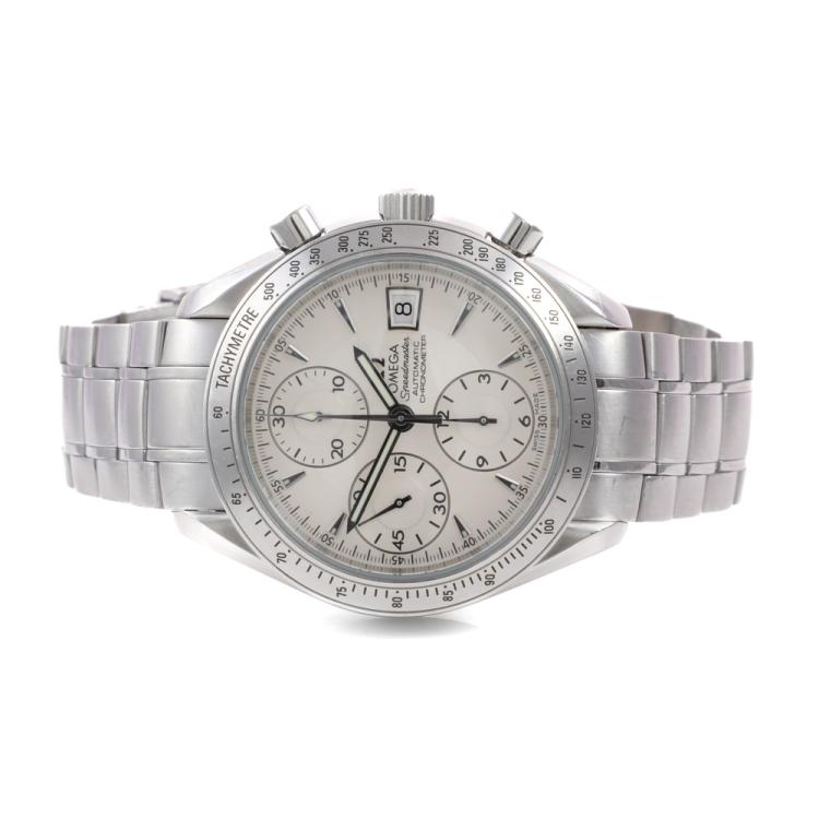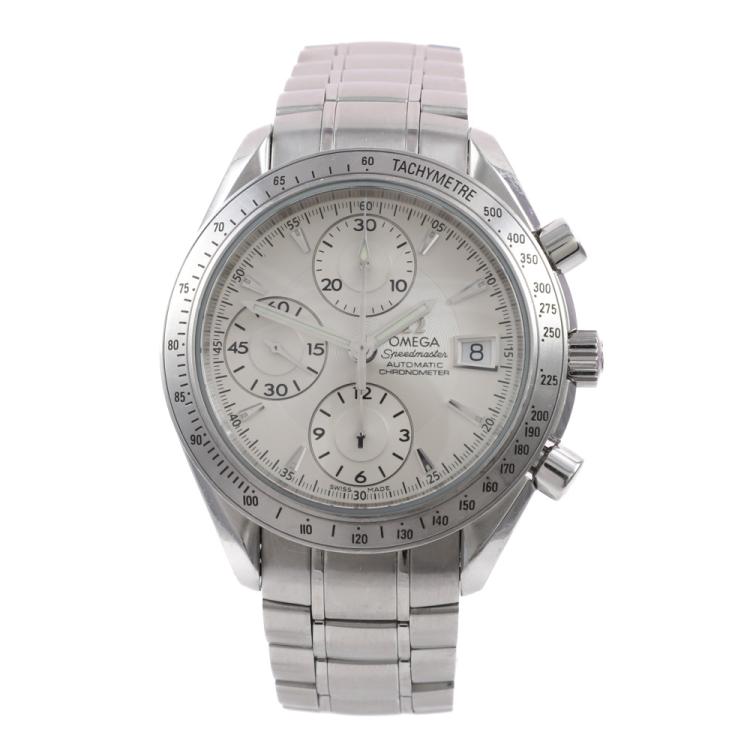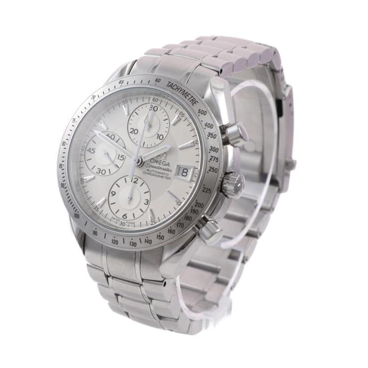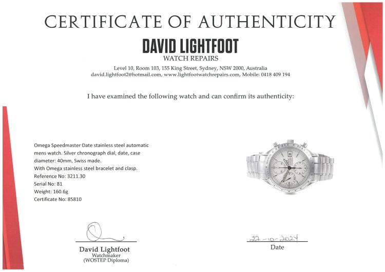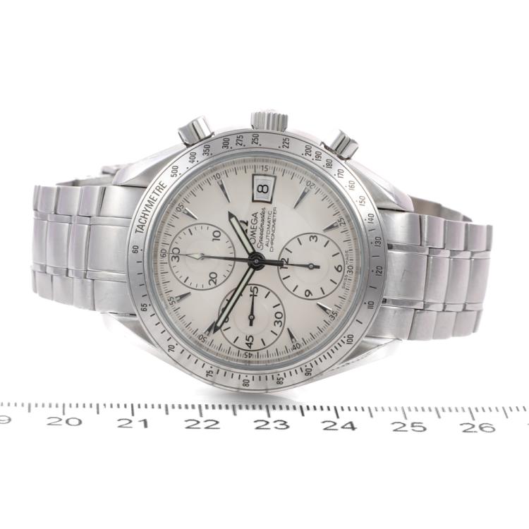 Omega Speedmaster Date stainless steel automatic mens watch. Silver chronograph dial, date, case diameter: 40mm, wrist size: 18cm, Swiss made. Ref# 3211.30. With Omega stainless steel bracelet and clasp. With Certificate of Authenticity. 3 month FSA warranty. (Pre-owned)