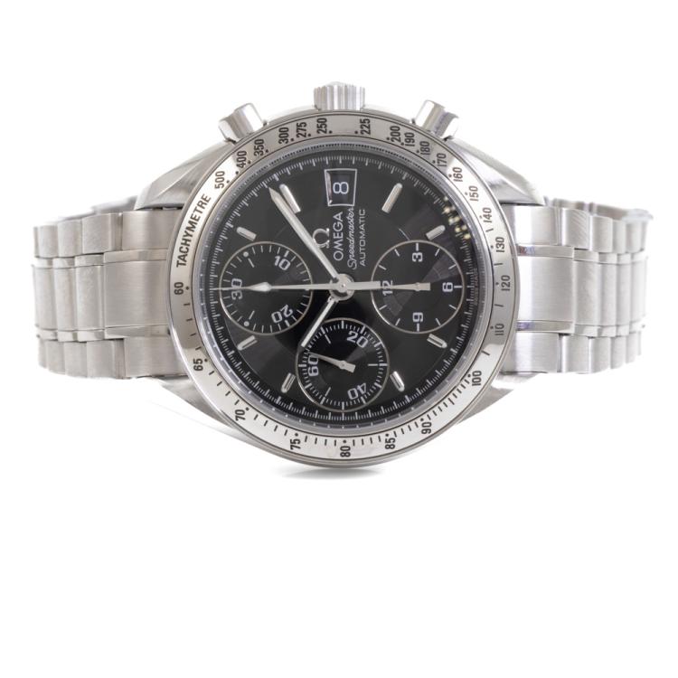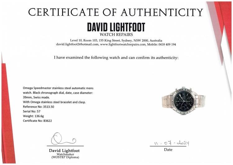 Omega Speedmaster stainless steel automatic mens watch. Black chronograph dial, date, case diameter: 39mm, wrist size: 21cm, Swiss made. Ref# 3513.50. With Omega stainless steel bracelet and clasp. With Certificate of Authenticity and Omega International warranty card dated 27/07/2017. 3 month FSA warranty (Pre-owned)