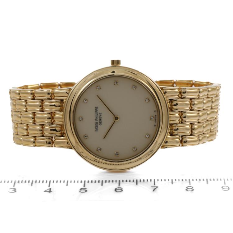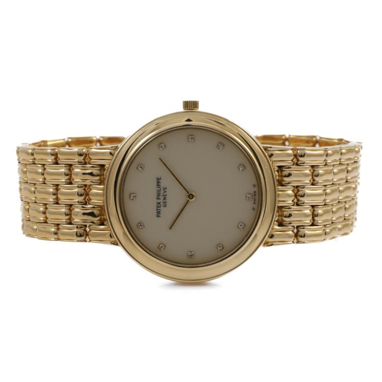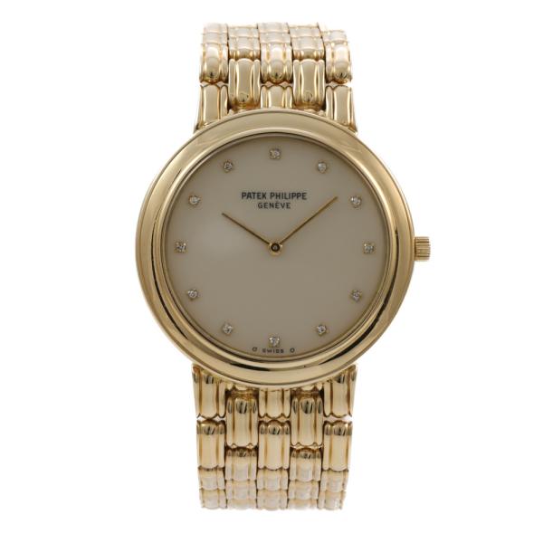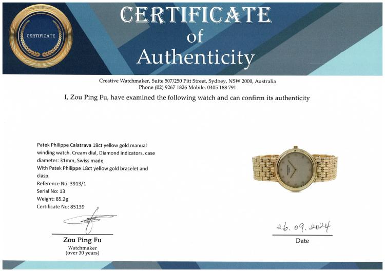 Patek Philippe Calatrava 18ct yellow gold manual winding watch. Cream dial, Diamond indicators, case diameter: 31mm, bracelet length including case: 16.5cm, Swiss made. Ref# 3913/1. With Patek Philippe 18ct yellow gold bracelet and clasp. With Certificate of Authenticity. 3 month FSA warranty. (Pre-owned)