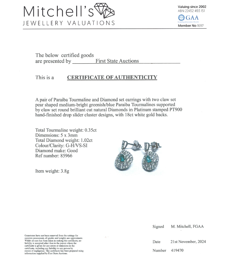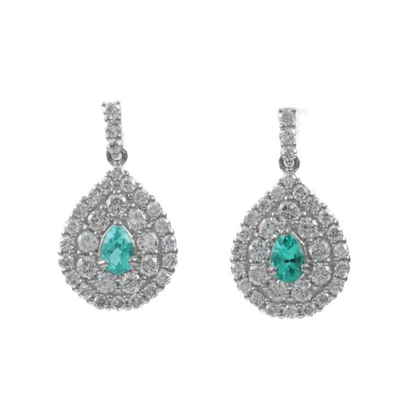 Tourmaline and Diamond earrings with pear shape Natural Paraiba Tourmalines totalling 0.35ct and round Natural Diamonds totalling 1.02ct. (Estimated grading: G-H VS-SI). Platinum - 900 with 18ct white gold backs. Dimensions: 18.0mm x 10.5mm. Weight: 3.8g. With Certificate #419470. (Pre-owned)