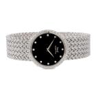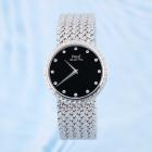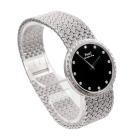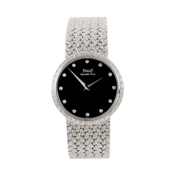 Piaget Tradition Vintage 18ct white gold quartz watch. Black dial, Diamond indicators, case diameter: 31mm, bracelet length: 19.5cm, Swiss made. Ref#7633D2W . With Piaget 18ct white gold mesh bracelet and clasp. With Piaget Certificate of Origin & Warranty 23/05/1981, Piaget International Repair Guarantee Certificate dated 03/04/25 & Piaget box with pouch. Balance of 24 month Piaget Complete Service from the date of full service. (Pre-owned)