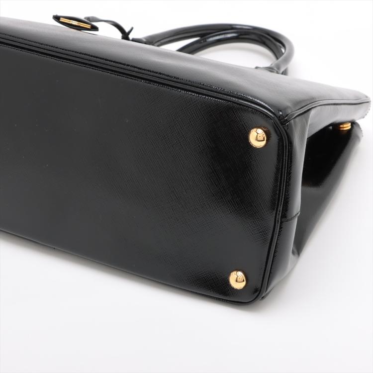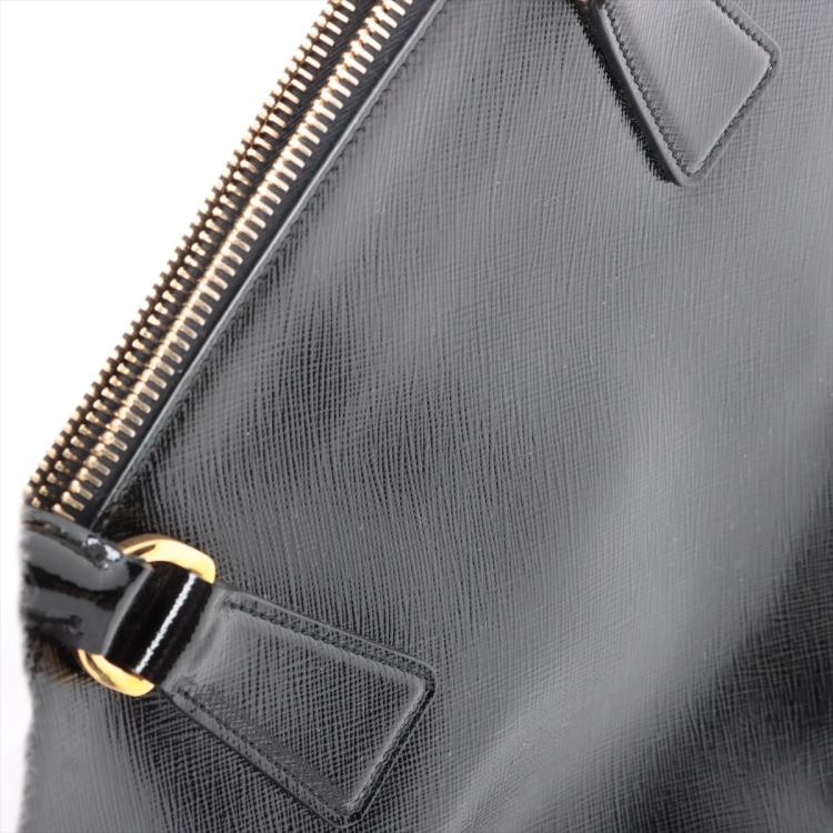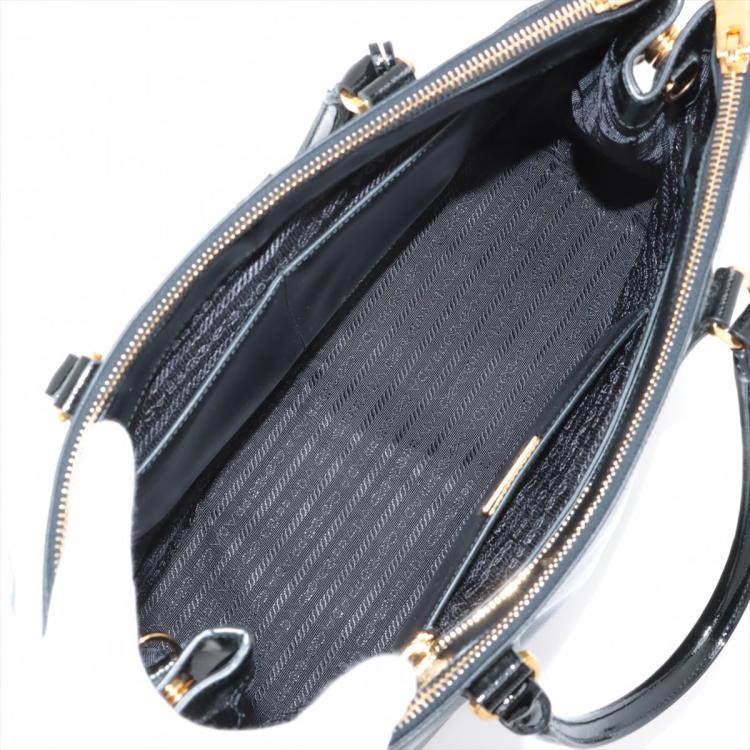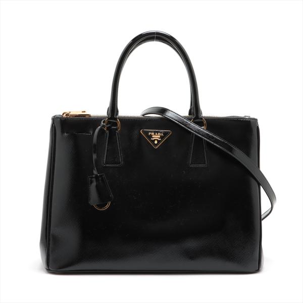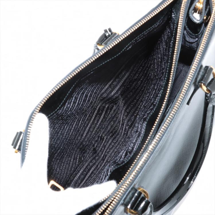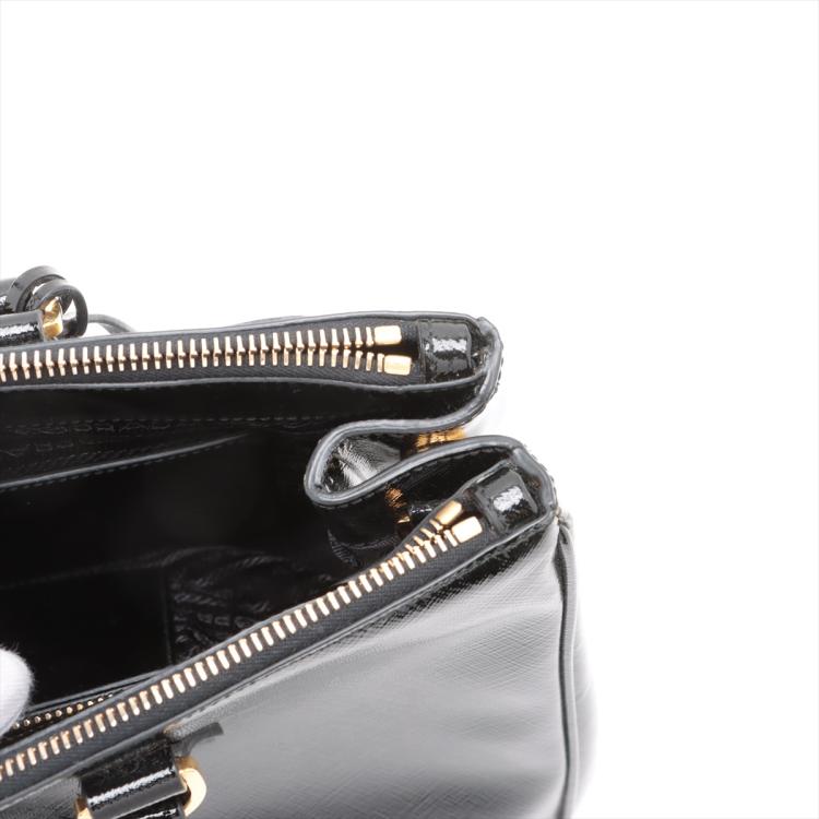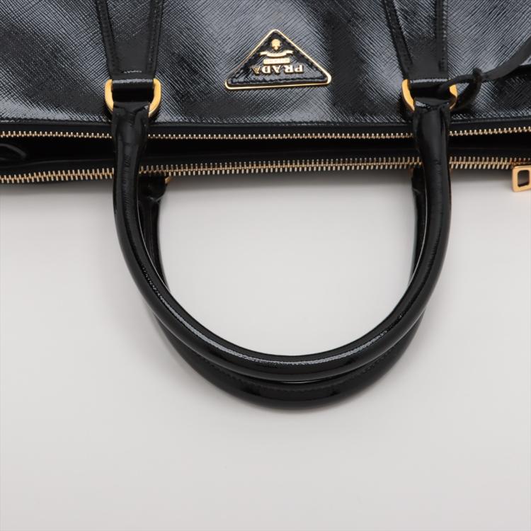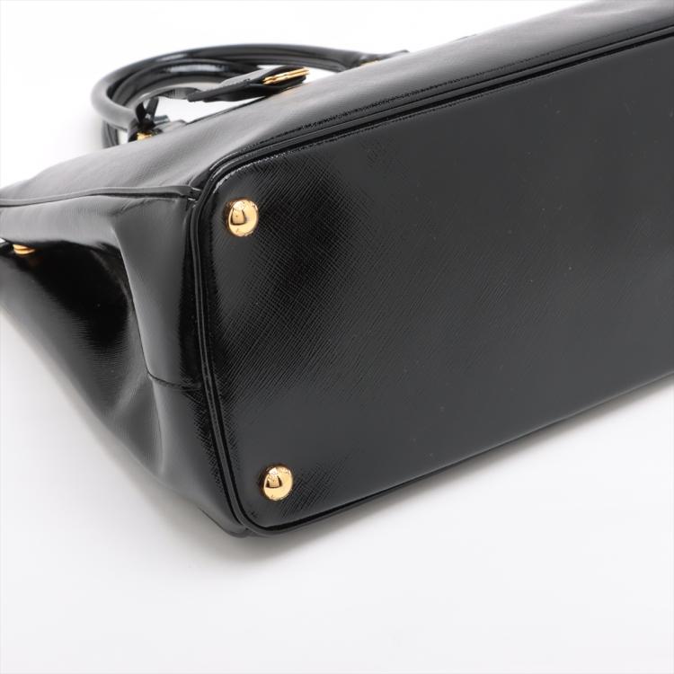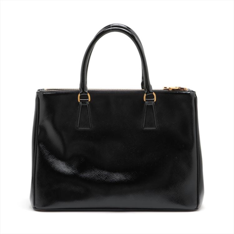 Prada large Galleria 2way bag in black Vernice Saffiano leather. Featuring gold-toned hardware, dual leather handles, two external zipper pockets, and snap closures on sides. The top opens to a black logo-print nylon interior with pockets. Approximate dimensions: 34cm(L) x 24cm(H) x 15cm(D), handle drop 13cm, detachable and adjustable shoulder strap 59cm. Accompanied by Prada crochet, keyring, dustbag, certificate card. With Entrupy Certificate of Authenticity. (Pre-owned)