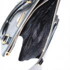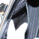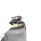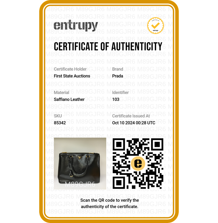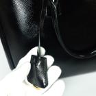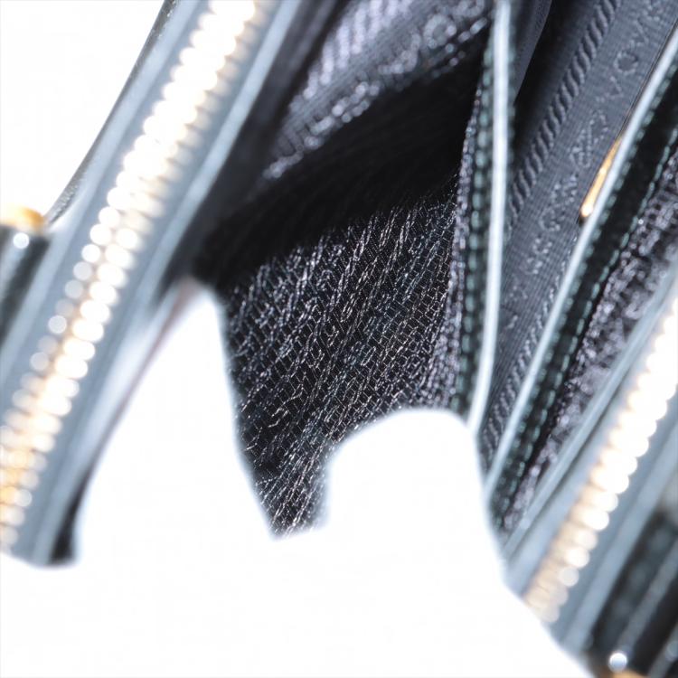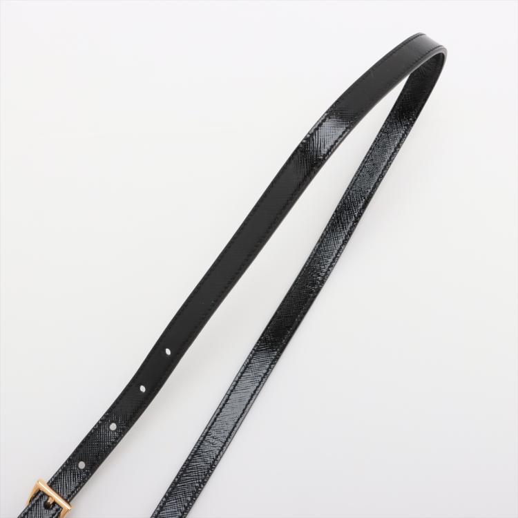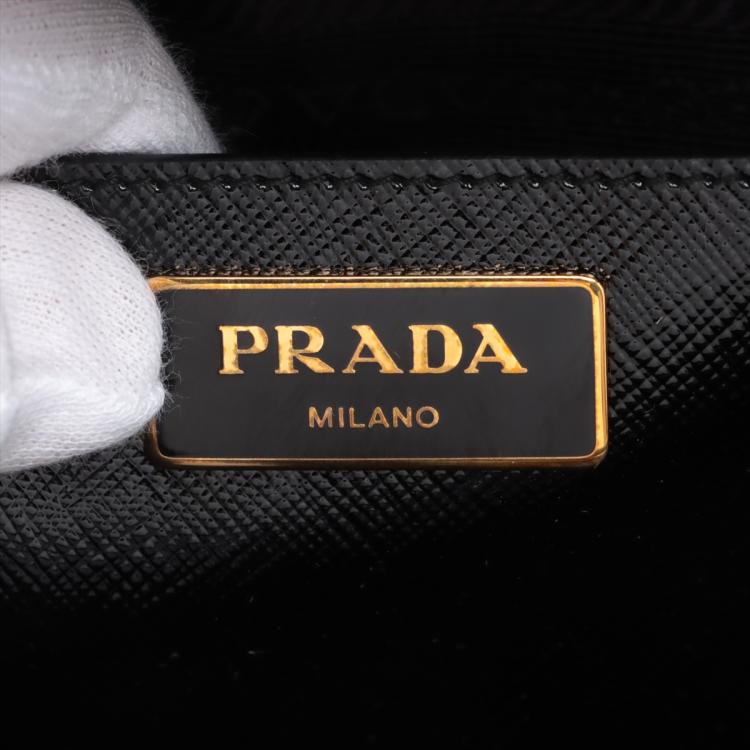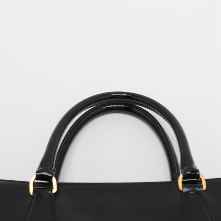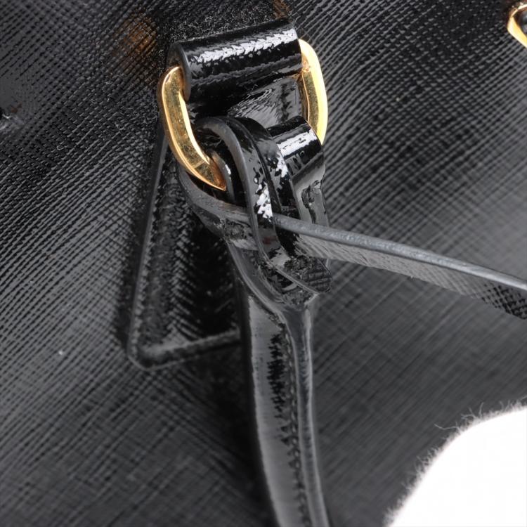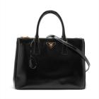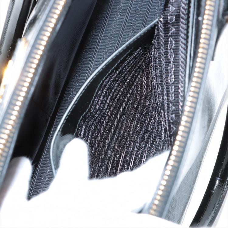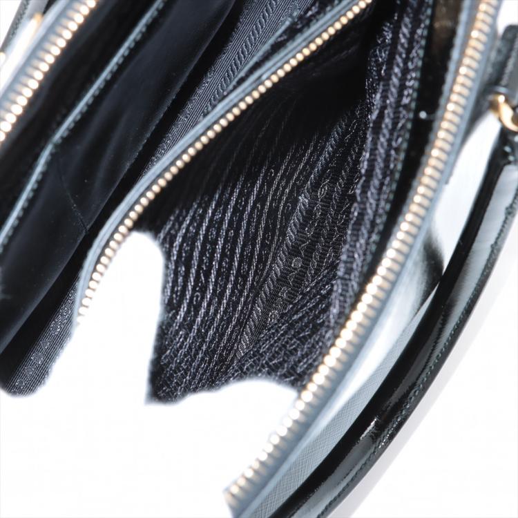 Prada large Galleria 2way bag in black Vernice Saffiano leather. Featuring gold-toned hardware, dual leather handles, two external zipper pockets, and snap closures on sides. The top opens to a black logo-print nylon interior with pockets. Approximate dimensions: 34cm(L) x 24cm(H) x 15cm(D), handle drop 13cm, detachable and adjustable shoulder strap 59cm. Accompanied by Prada crochet, keyring, dustbag, certificate card. With Entrupy Certificate of Authenticity. (Pre-owned)
