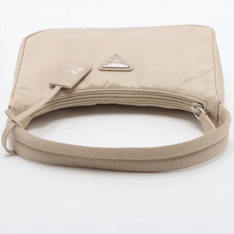 Prada Re-Edition 2000 mini-bag in beige Tessuto nylon. Featuring silver-toned hardware, woven tape handle, triangle logo plate at front. The top zipper closure opens to a logo-print Re-Nylon lining interior. Approximate dimensions: 22.5cm(L) x 17.5cm(H) x 5.5cm(D), 15cm handle drop. Accompanied by a Saffiano leather tag with a key ring, Prada certification card and a dust bag. With Entrupy Certificate of Authenticity. (Pre-owned)