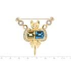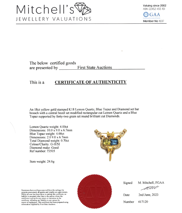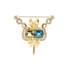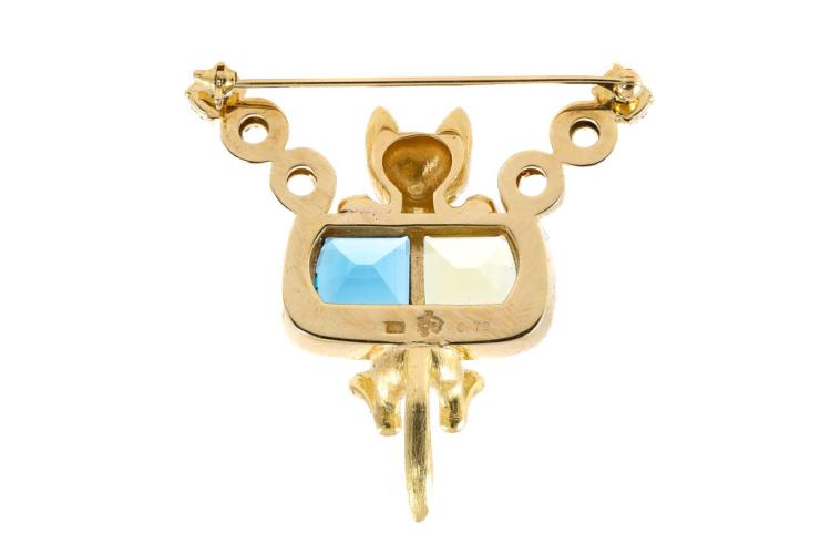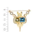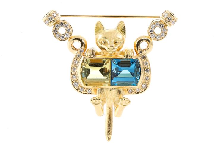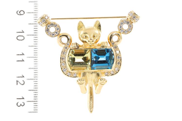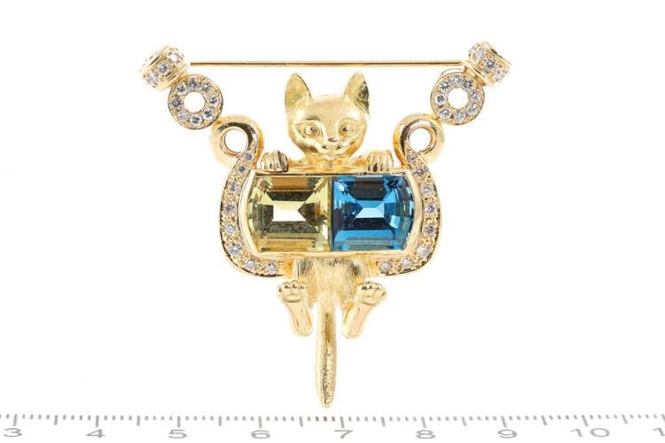 Quartz, Topaz and Diamond cat designed brooch with fancy cut Natural Lemon Quartz of 4.00ct, fancy cut blue Natural Topaz of 4.00ct and round Natural Diamonds totalling 0.70ct (Estimated grading: G-H SI). 18ct yellow gold. Weight: 24.6g. With Certificate #417120. (Pre-owned)