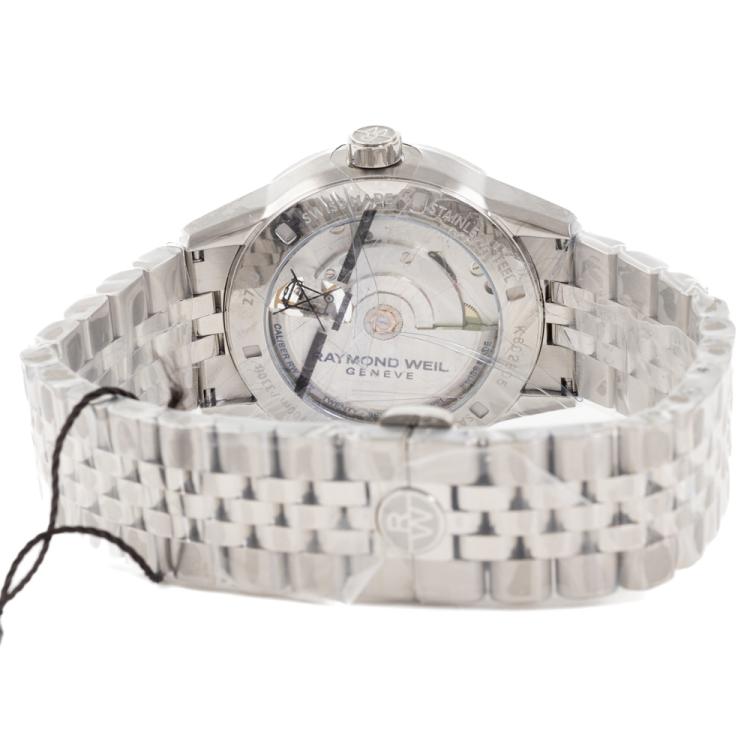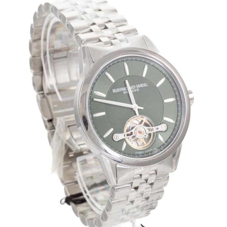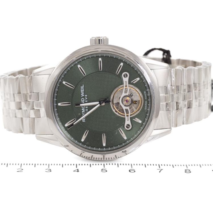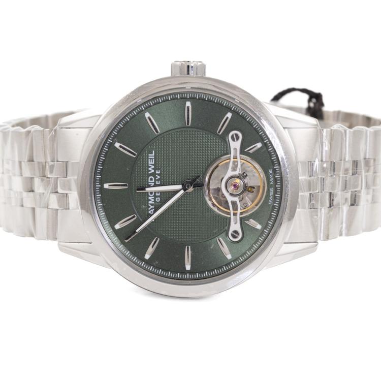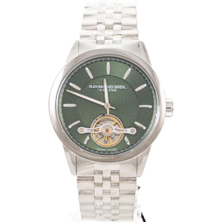 Raymond Weil Freelancer stainless steel automatic mens watch. Green dial, case diameter: 42.5mm, wrist size: 21.5cm, Swiss made. Ref# 2780-ST-52001. With Raymond Weil stainless steel bracelet and clasp. With Undated Raymond Weil Guarantee card and Raymond Weil box. 12 month FSA warranty (As new, Note: case and bracelet on original wrap)