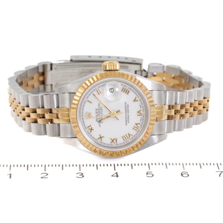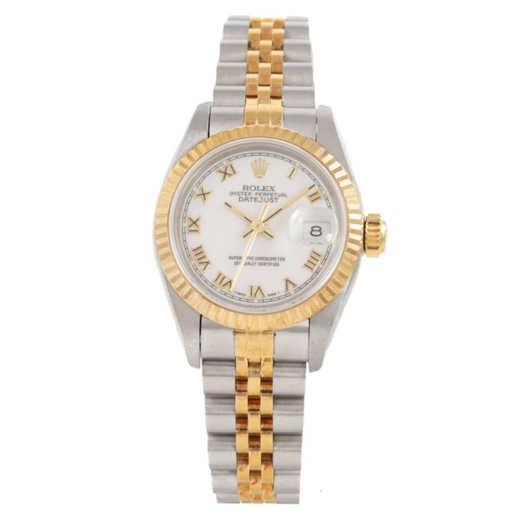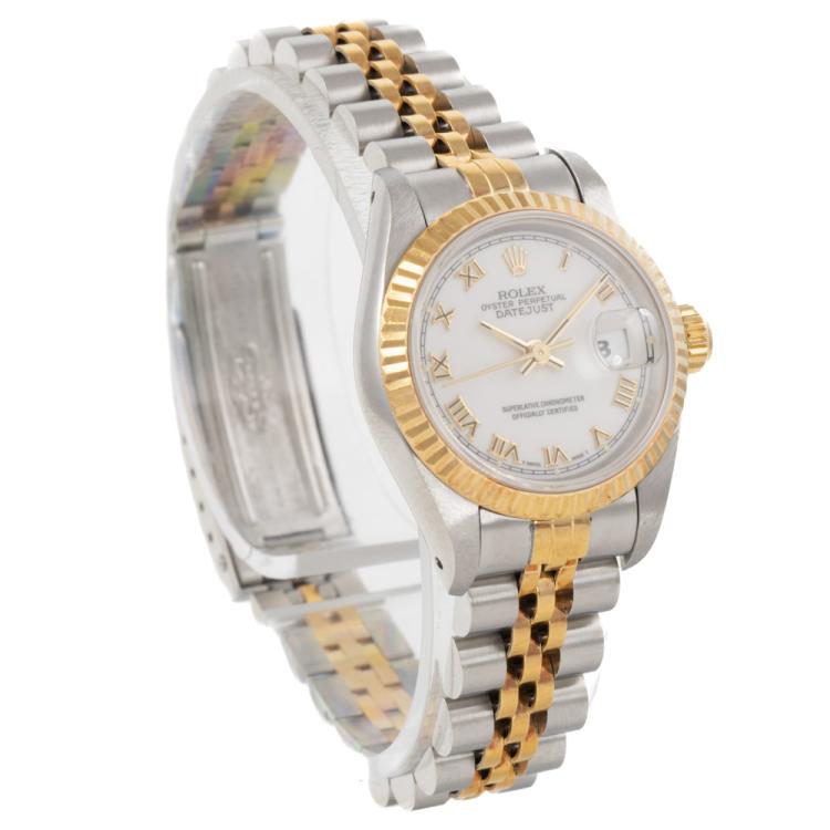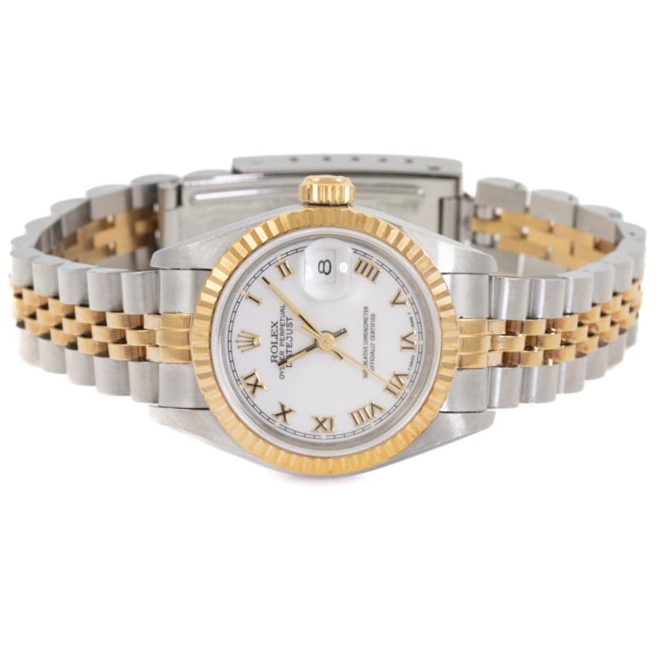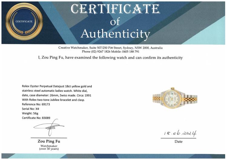 Rolex Oyster Perpetual Datejust 18ct yellow gold and stainless steel automatic ladies watch. White dial, date, case diameter: 26mm, wrist size: 16.5cm, Swiss made. Ref# 69173. Circa: 1991. With Rolex two-tone Jubilee bracelet and clasp. With Certificate of Authenticity and Rolex box. 6 month Creative Watchmaker warranty from the date of full service. (Pre-owned)