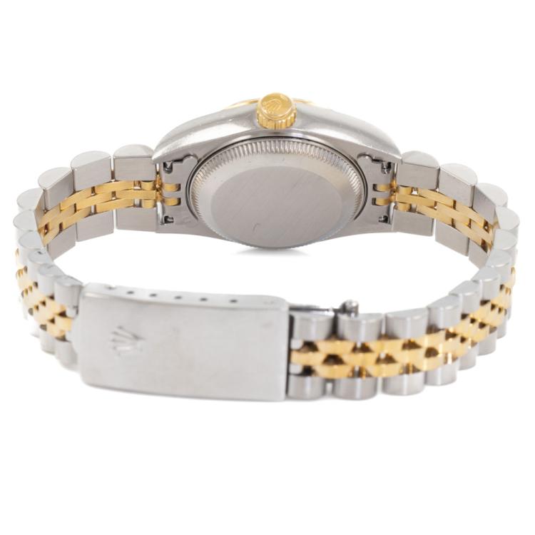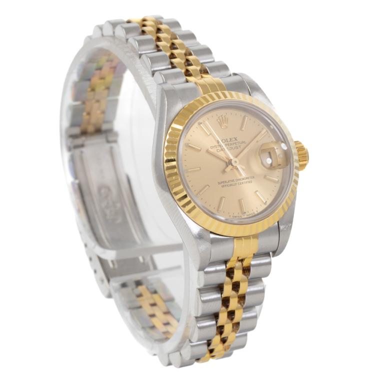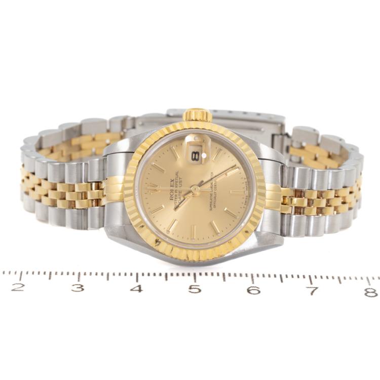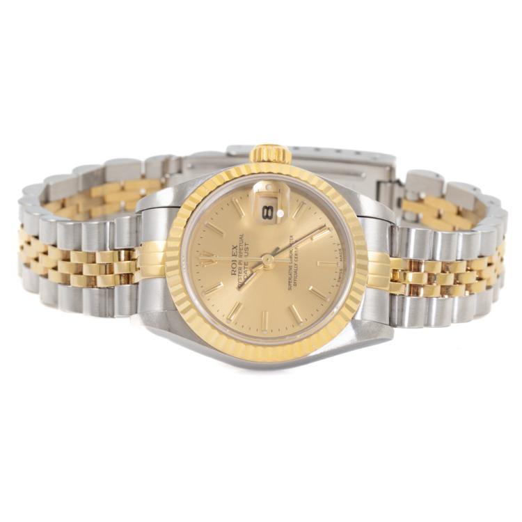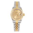 Rolex Oyster Perpetual Datejust 18ct yellow gold and stainless steel automatic ladies watch. Gold dial, date, case diameter: 26mm, wrist size: 17cm, Swiss made. Ref# 69173. Circa: 1996. With Rolex two-tone Jubilee bracelet and clasp. With Certificate of Authenticity, Rolex Guarantee Certificate dated 25/11/1996 and Rolex box. 3 month FSA warranty (Pre-owned)
